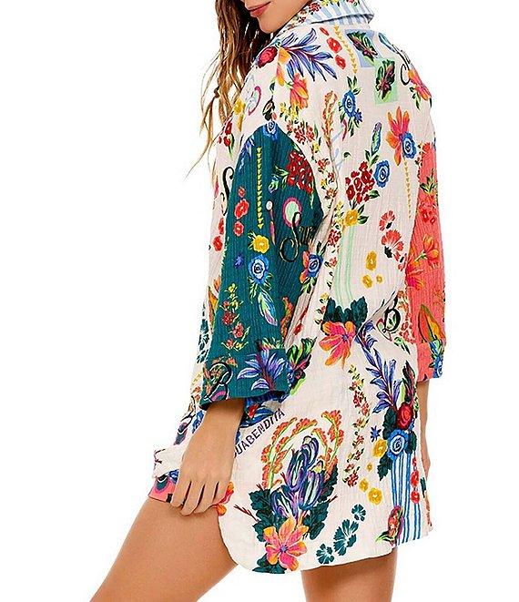 From Agua Bendita, this shirt features: Woven fabrication Floral placement print Point collar neckline 3/4 sleeves Shirttail hem Button front closure Approx. 35.04" length Cotton/elastane Hand wash Imported.