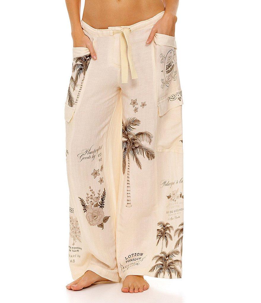 From Agua Bendita, this pant features: Woven fabrication Palm tree placement print Light cargo silhouette Tie waist Side seam pockets, functional flap patch pockets, functional back patch pockets Pull-on construction Approx. 28.35" length Viscose/linen Hand wash Imported.