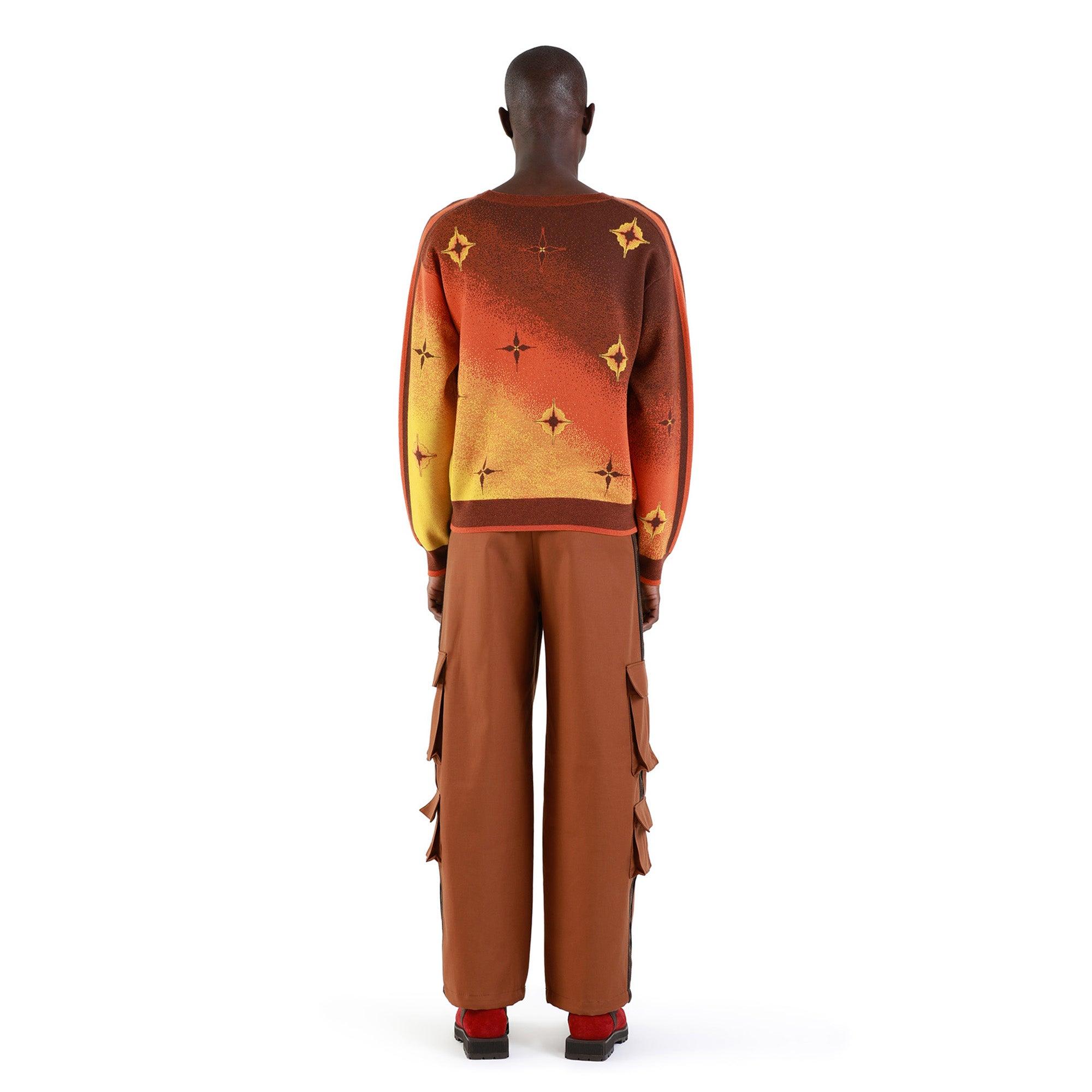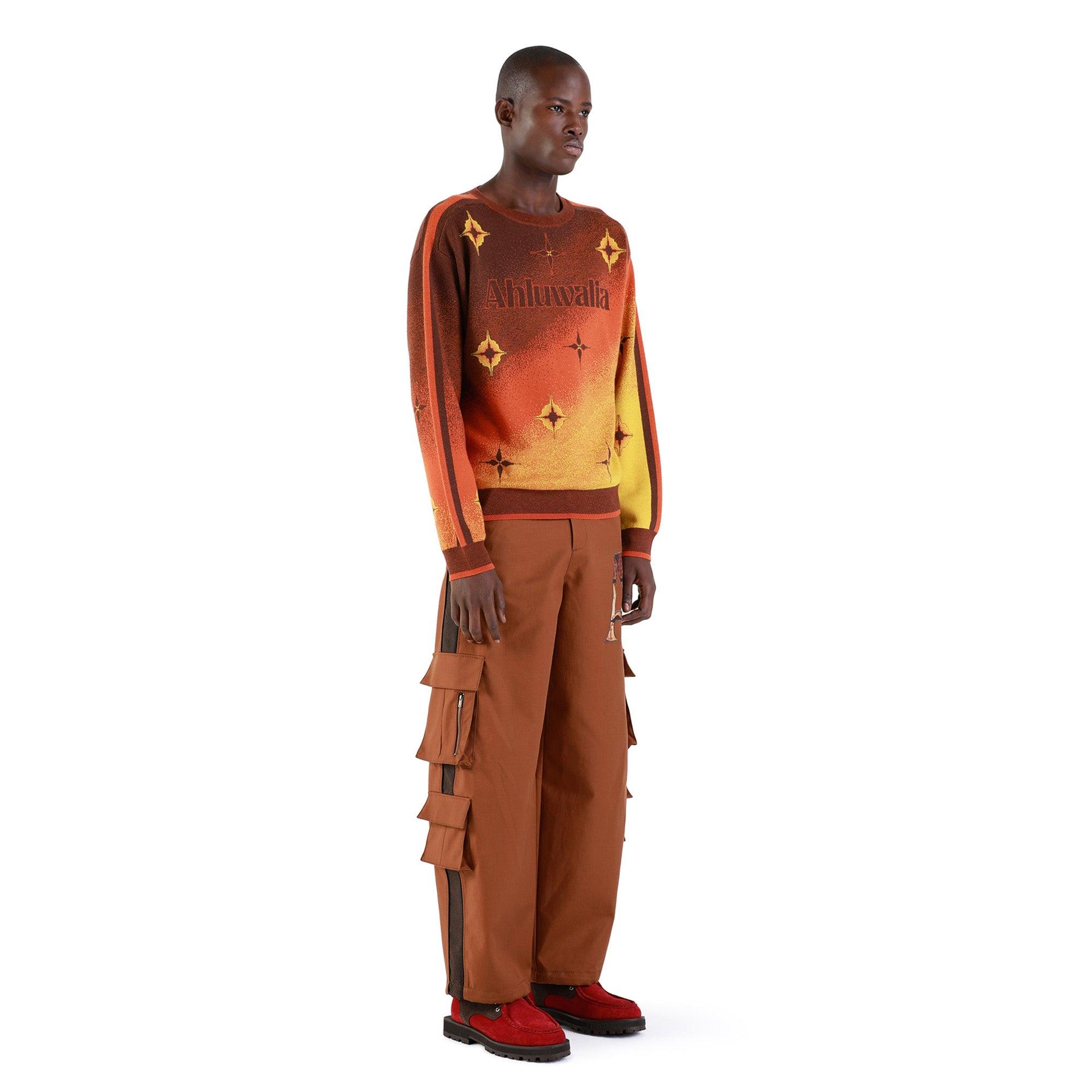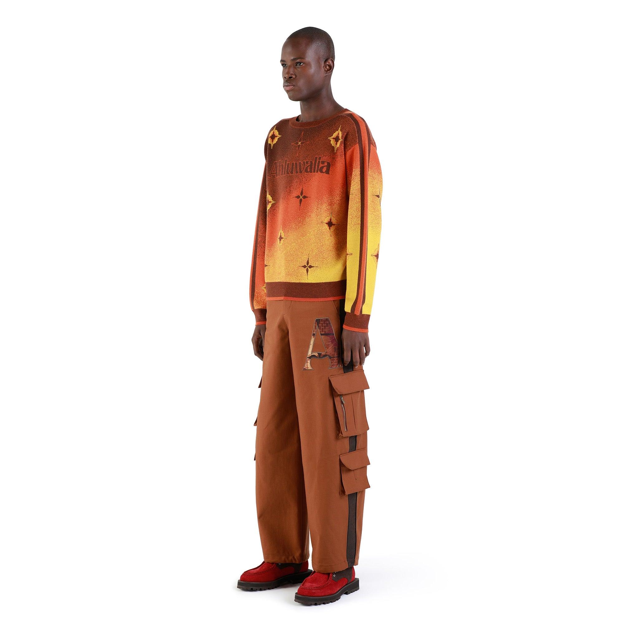 Description: The Ahluwalia Logo Knitted Crew is made from 100% merino wool, offering warmth and softness with a sleek fit. This crewneck sweater showcases an ombre gradient design along with motifs inspired by nostalgic floor tiling. The sleeves have contrast brown and orange panels, that is reflected on the edges of the hem and cuffs. Sizing: Click here for size guide. For further sizing assistance please contact us on