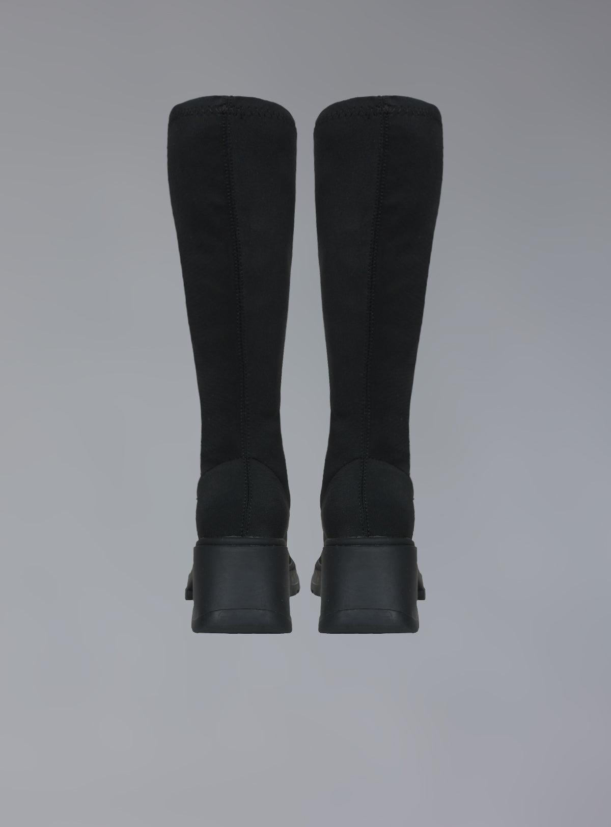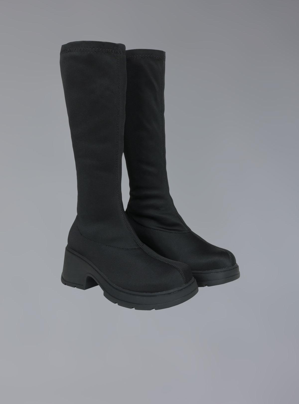 The AIA Boot is the taller sister of our Joss Boot. Calf-high stretchy neoprene upper with a split seam up the front and a stacked rubber platform sole. Sole measures 1" at the front to 2.5" at the heel. Comes in multiple colorways. Click Here for a printable size chart (make sure you print at Actual Size to ensure accuracy) For any questions about sizing please reach out to our team ~