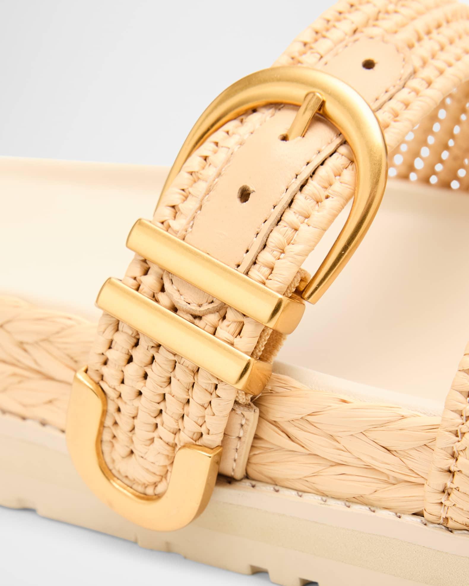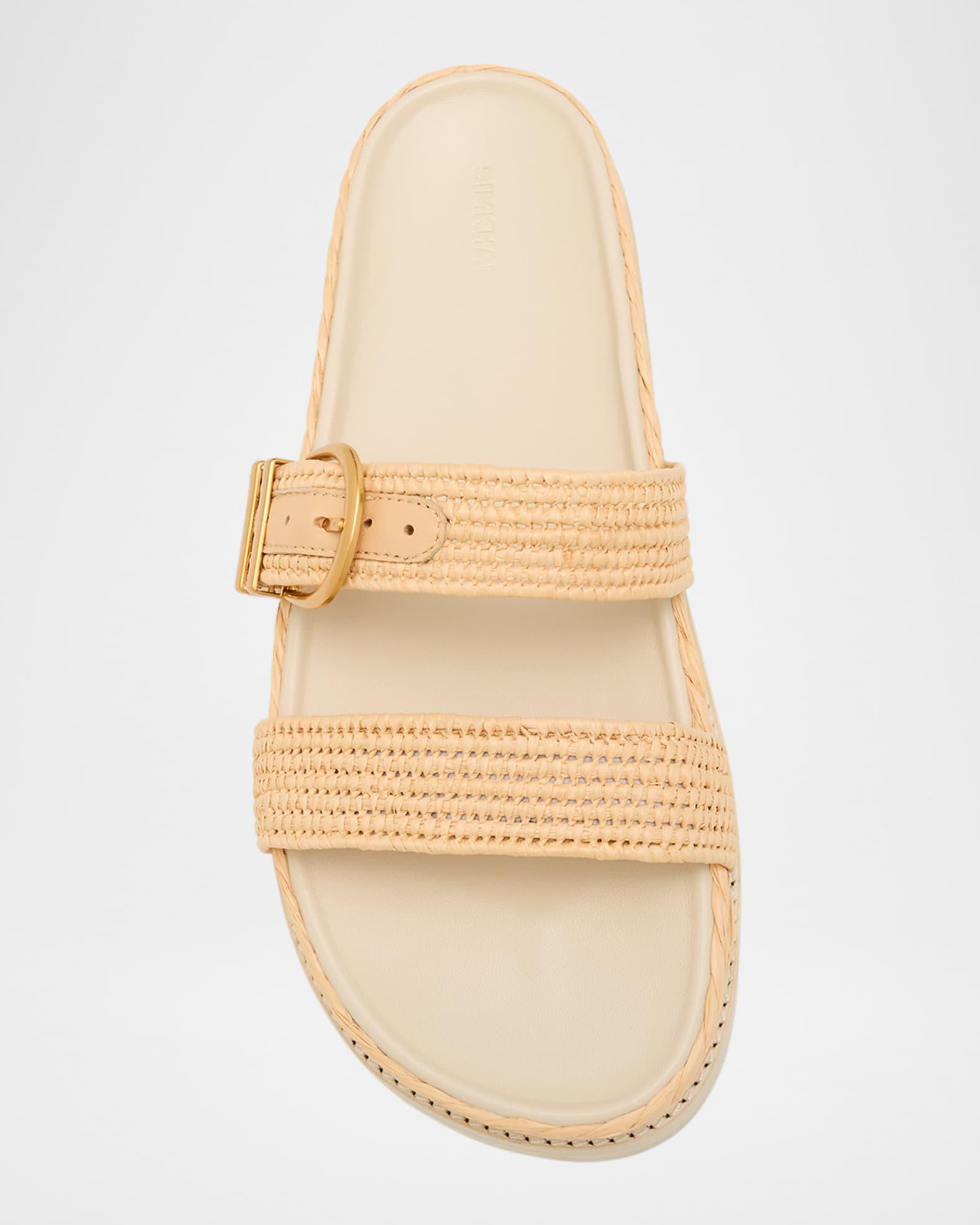 SIMKHAI "Aida" woven raffia sporty espadrille sandals with leather trim Flat braided-jute heel Open toe Dual band upper with buckle strap accent Slide style Leather outsole Lining: Leather Fits true to size Imported