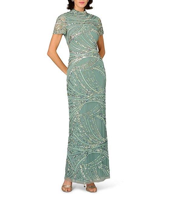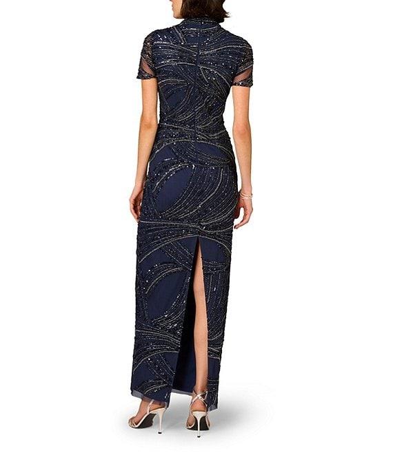 Aidan Mattox Beaded Mesh Short Sleeve Column Long Gown