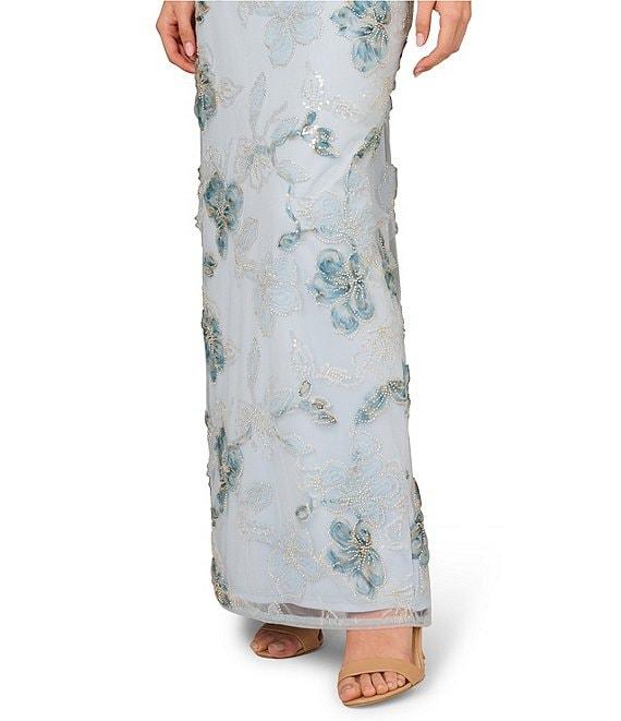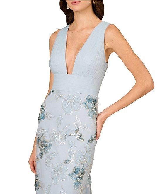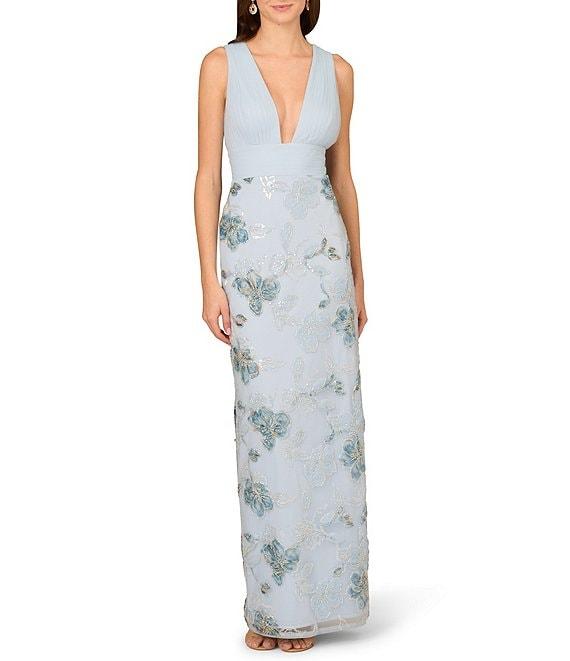 From Aidan Mattox, this dress features: Embroidered fabrication Column silhouette V-neckline Sleeveless Pleated mesh bodice Fully lined Straight hemline Center back zip closure Approx. 60.75" length Polyester; lining: polyester Dry clean Imported.