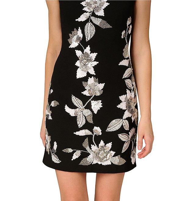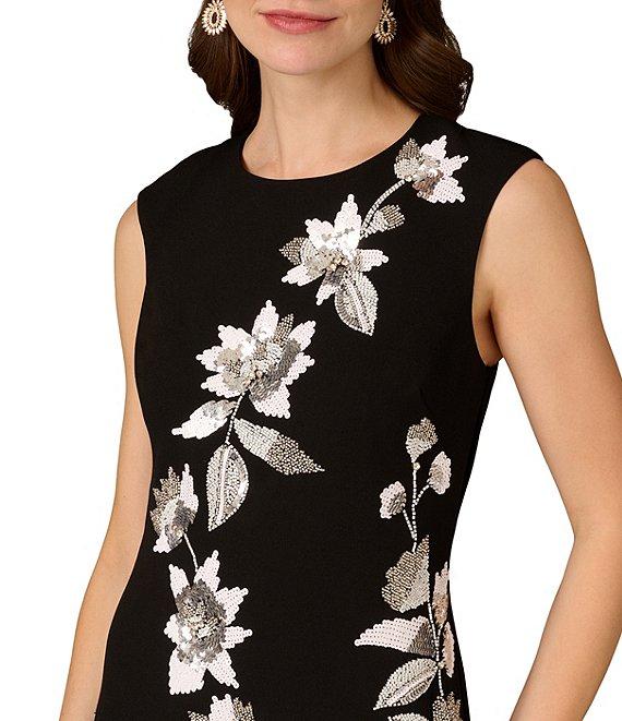 From Aidan Mattox, this dress features:Beaded knit crepe fabricationSheath silhouetteFloral patternCrew neckline Cap sleeves Side seam pocketsFully lined Straight hemline Center back zip closure Approx. 36" lengthPolyester/elastane; lining: polyesterSpot cleanImported.