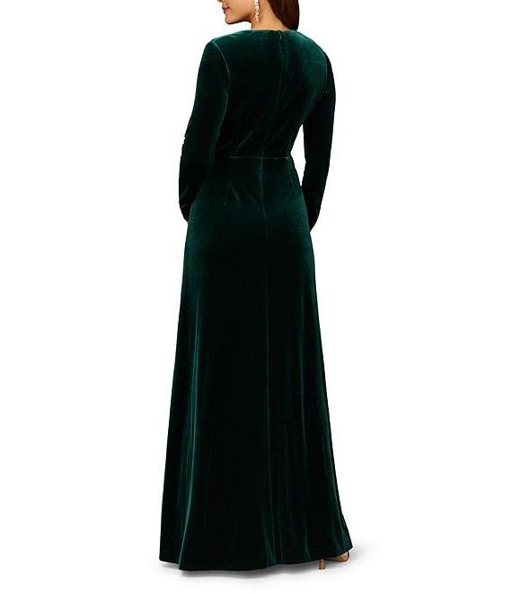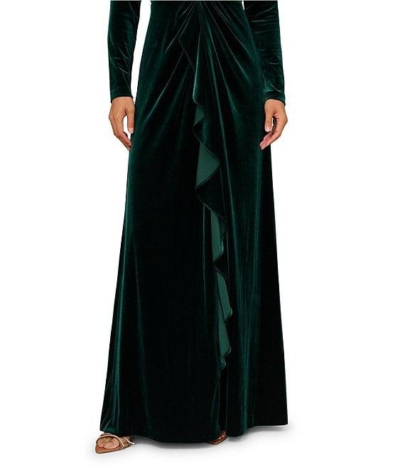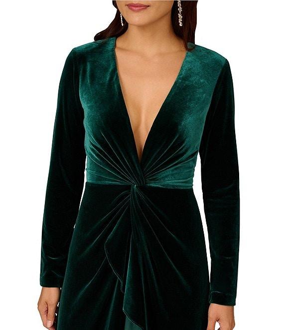 From Aidan Mattox, this dress features: Velvet fabrication A line silhouette Deep v-neckline Long sleeves Front twist with ruffle Zip back closure Approx. 62" length Polyester/elastane Dry clean Imported.