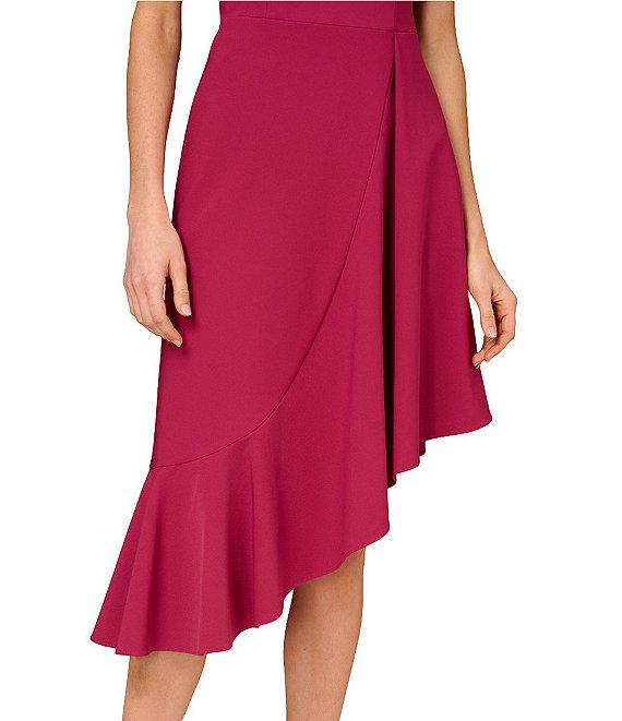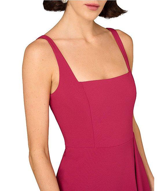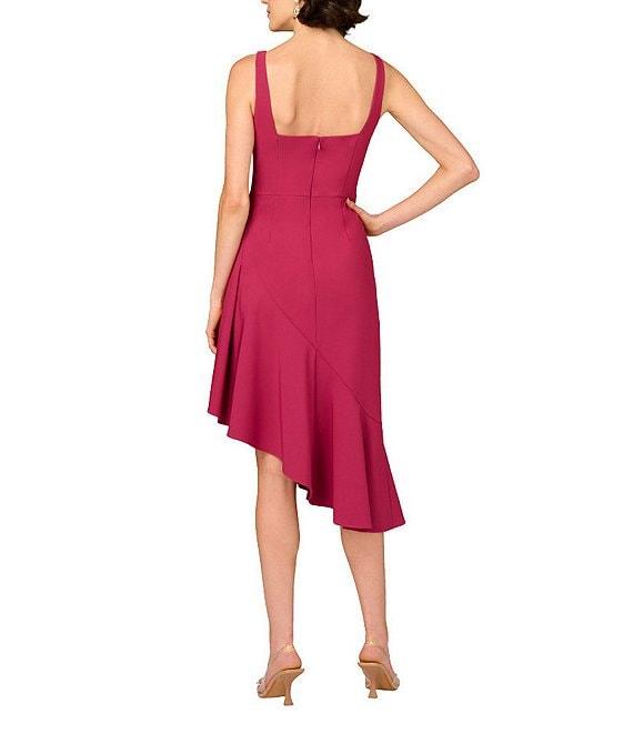 From Aidan Mattox, this dress features:Stretch crepe fabricationA-line silhouetteSquare neckline SleevelessWide straps Drape skirt Fully lined Ruffle asymmetrical hemline Center back zip closure Approx. 44" lengthPolyester/elastaneDry cleanImported.