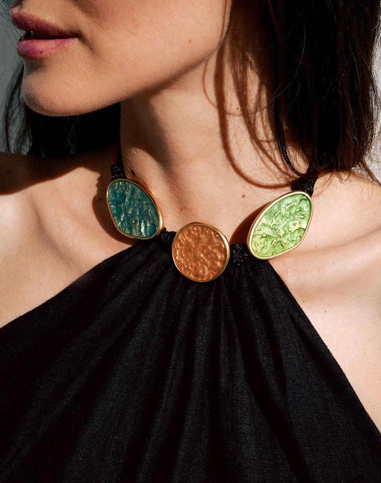 The ViX Aiden Short Dress is a sleeveless shift silhouette with a high neckline, accented by the signature Petra detail in gold-tone resin medallions. Designed with a straight fit, it features an open back and adjustable neck tie closures. Style the Aiden Short Dress with sandals and ViX accessories for a resort-ready