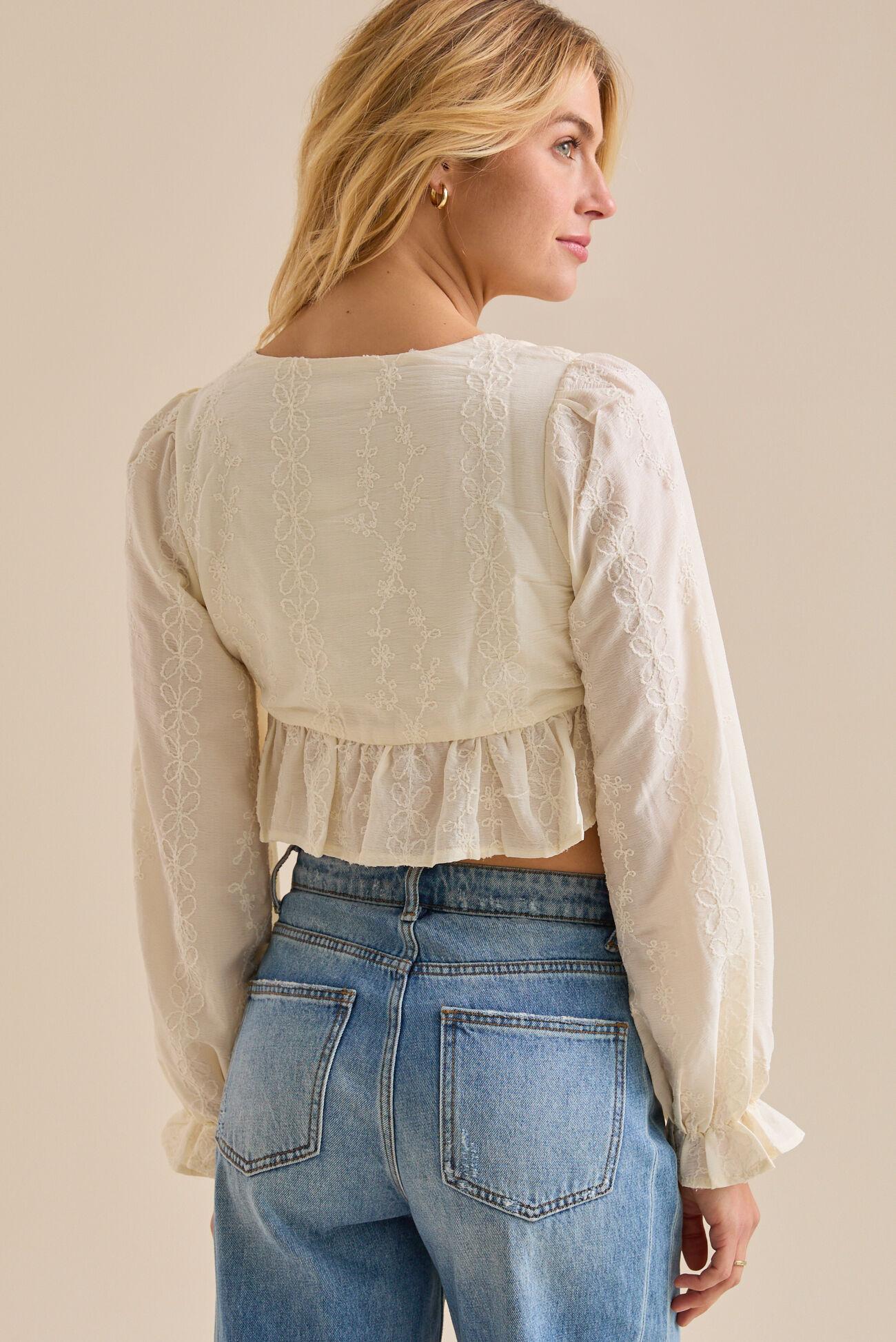 Broderie Ruched Tie Front Balloon Sleeve Top