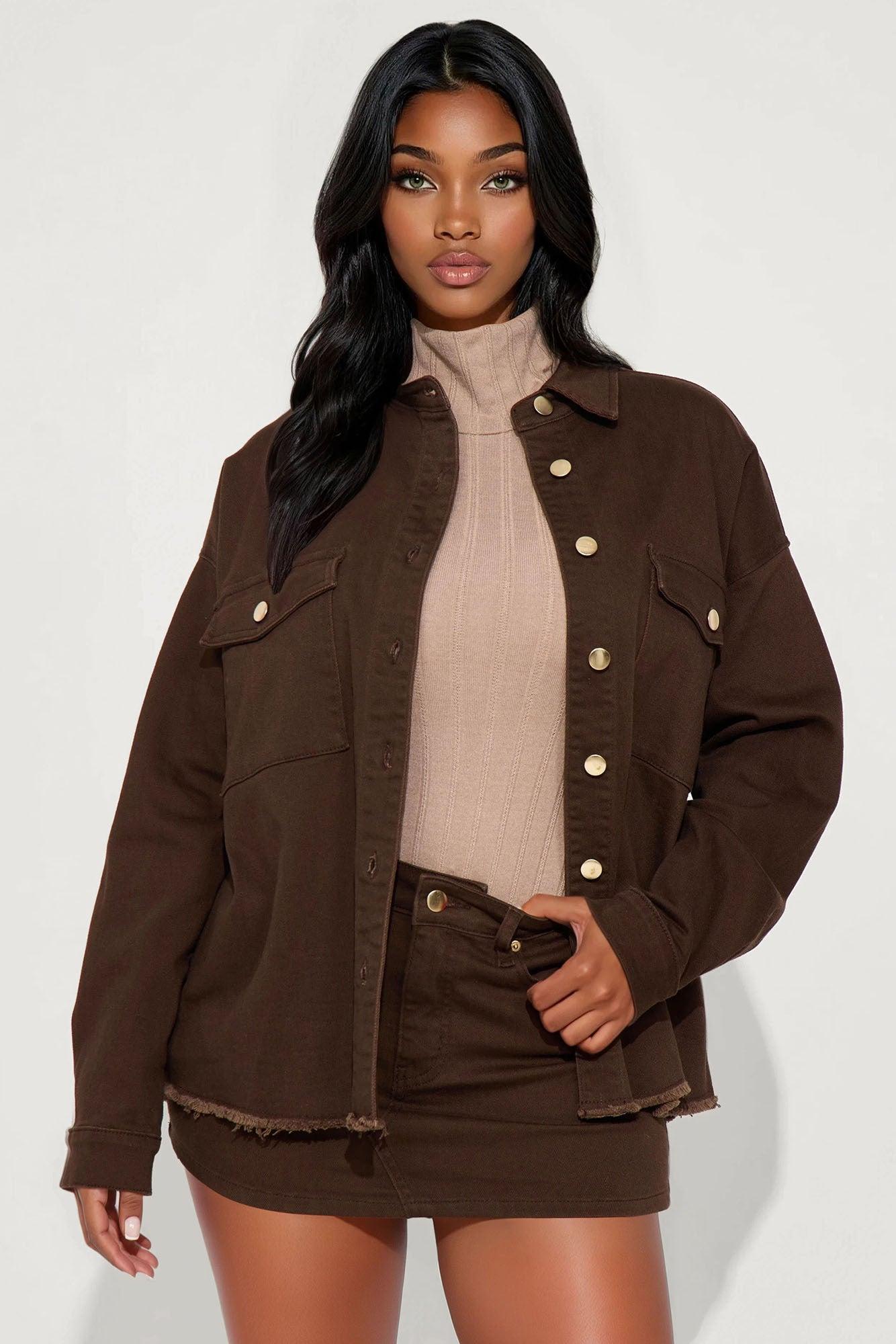 Available In Chocolate. 2 Piece Ensemble Shacket And Mini Skirt Set Stretch Skirt Length 14" Pockets Self: 98% Cotton 2% Spandex Imported California Proposition 65WARNING: Cancer and Reproductive Harm - www.P65Warnings.ca.gov.