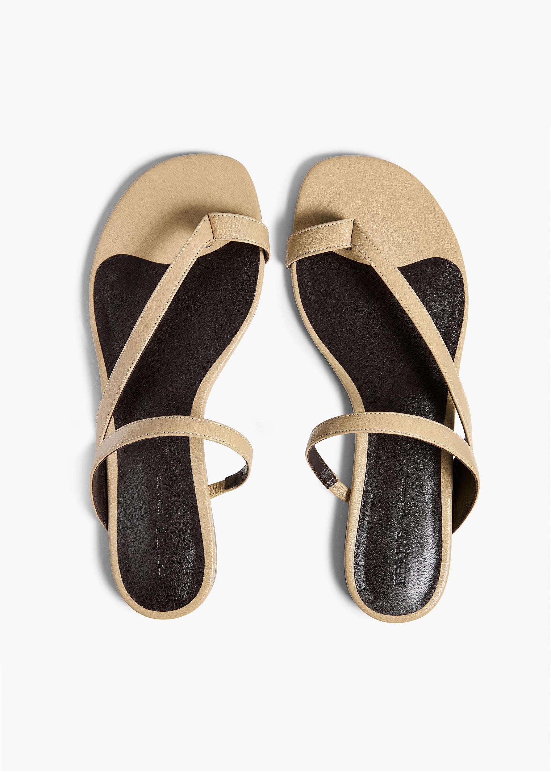 A refined slip-on sandal that combines bare coverage with the support of angled straps and a toe loop. Elasticated inset at interior for all-day comfort.