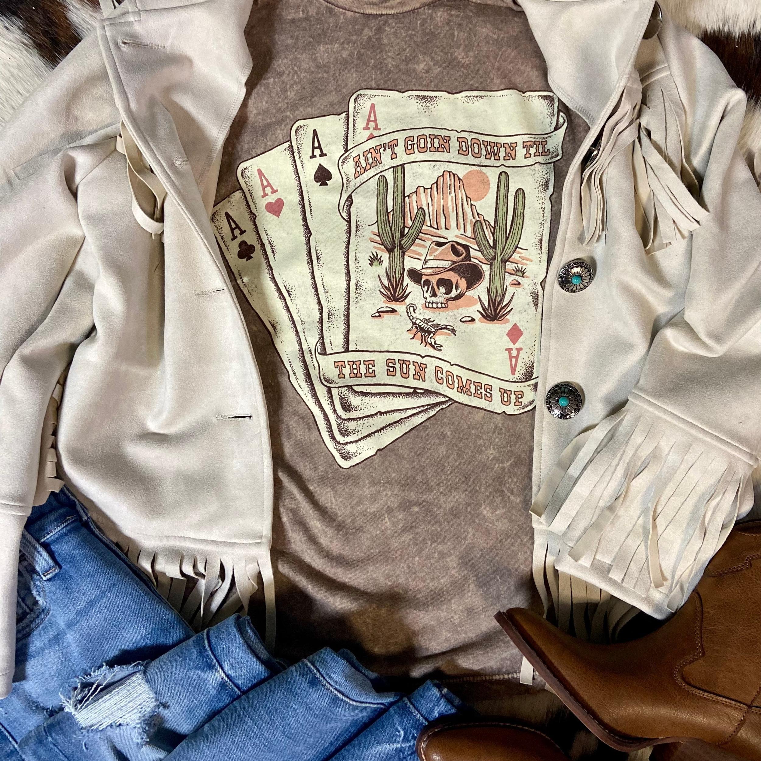 The Ain't Going Down Mineral Washed Tee is a Mocha Colored loose fit tee featuring an open neckline and slightly dropped sleeves. 100% Cotton mineral washed "Ain't Going Down Till The Sun Comes Up"