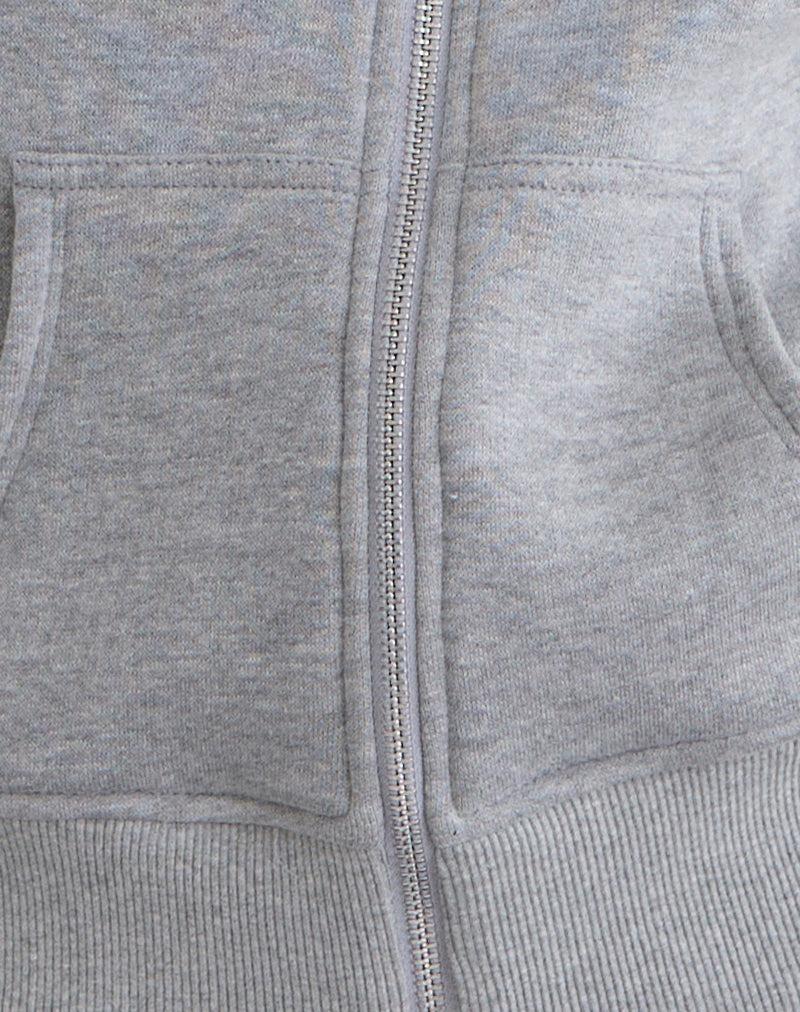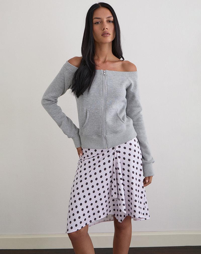 The Airazo sweater in a grey marl fleece fabric. Off the shoulder long sleeve sweater top. Featuring a functional zipper down the front and finished with pockets. Finish the look with the Esmeray skirt. MODEL WEARS SIZE: EXTRA SMALL - MODEL HEIGHT:5'7