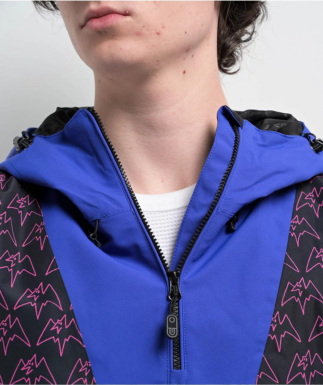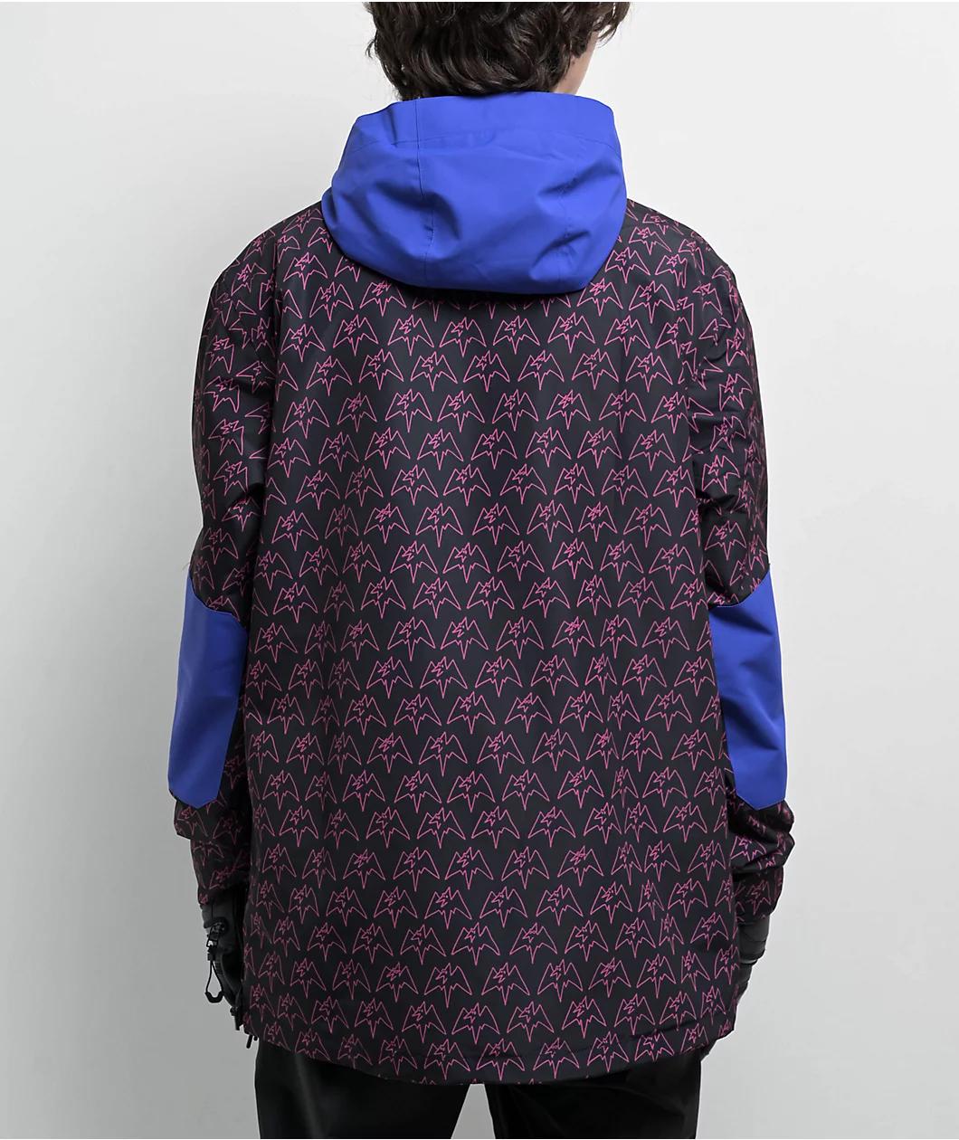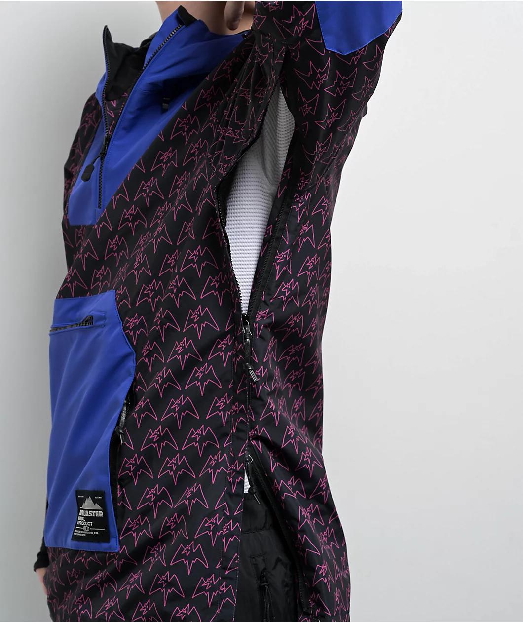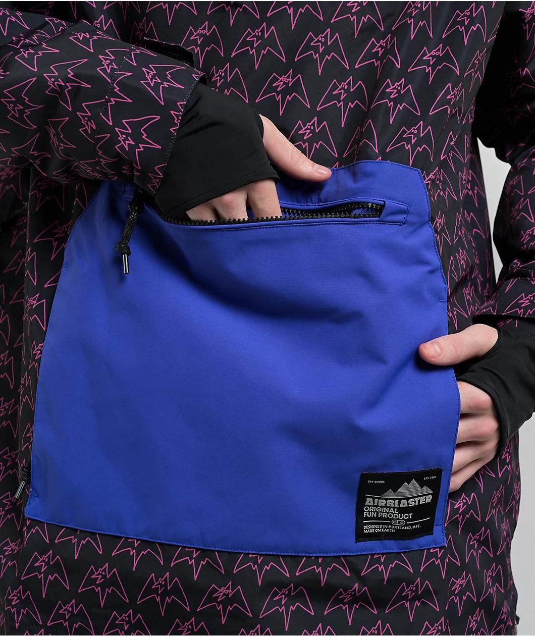 Lending fun style with a 10K waterproof rating, Airblaster proudly presents the Freedom anorak snowboard jacket in a "Magenta Terry" black and blue color scheme with a sublimated pattern. Strategically taped seams prevent moisture from entering the j