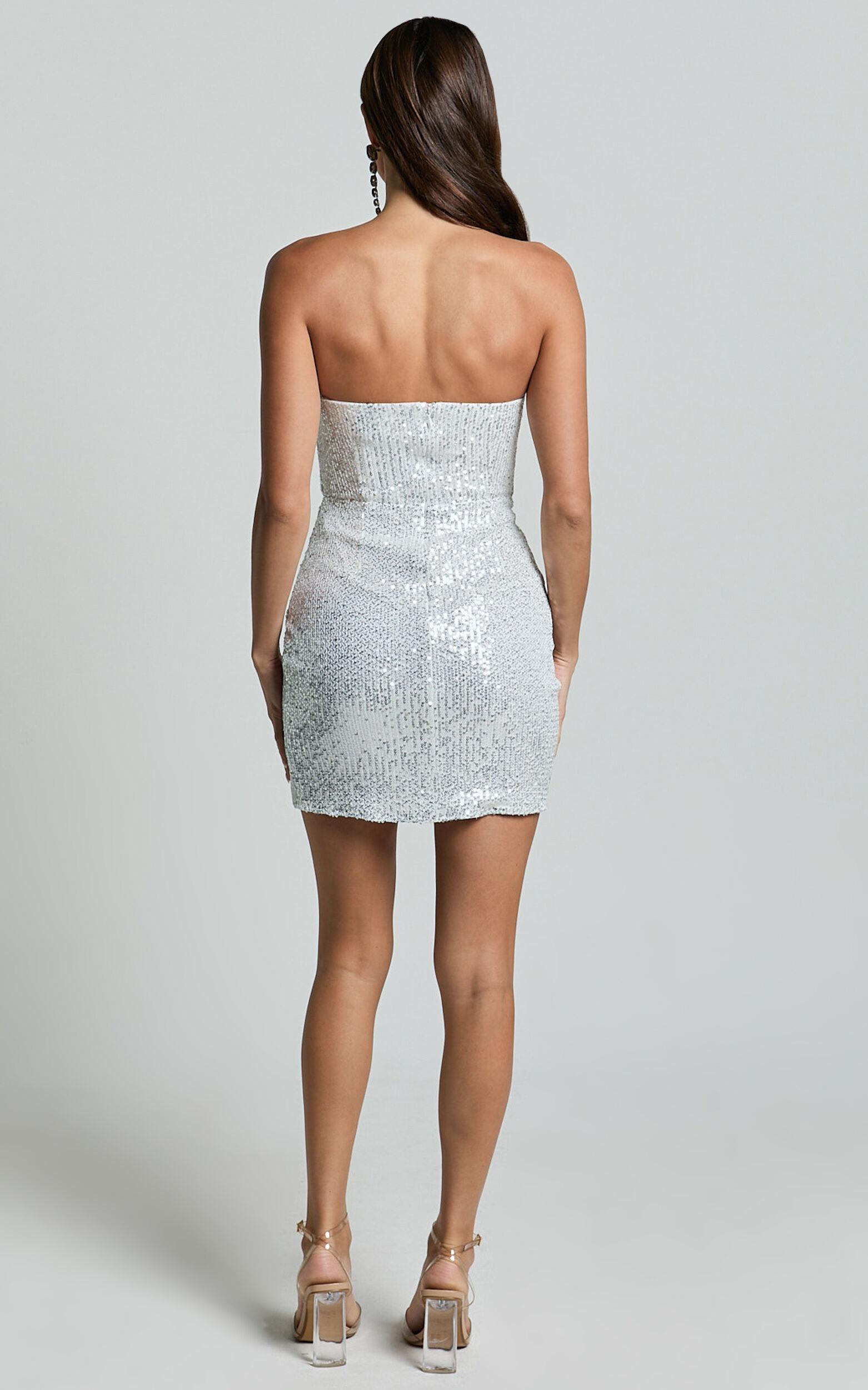 Get ready to shine bright like a diamond in our Akhira Mini Dress! This stunning silver sequin dress is perfect for any party night or weekend activity where you want to turn heads and steal the spotlight. The corset detail adds a flirty touch, while the strapless design shows off your shoulders and décolletage. Crafted with love, this bodycon dress hugs your curves in all the right places, making you feel confident and sexy all night long. Whether you're hitting the dance floor or sipping cocktails at a rooftop bar, this mini dress will make sure all eyes are on you. So go ahead and unleash your inner glam goddess - it's time to sparkle and shine!Product Details:Bodycon mini dressMade with sequin fabricStrapless necklinePerfect for parties and weekend activitiesSize and FitSize S / 8 length: 66cm / 25.98inMaterial and CareMain Fabric: 95% Polyester, 5% Spandex Lining: 92% Polyester, 8% SpandexLow / No stretch