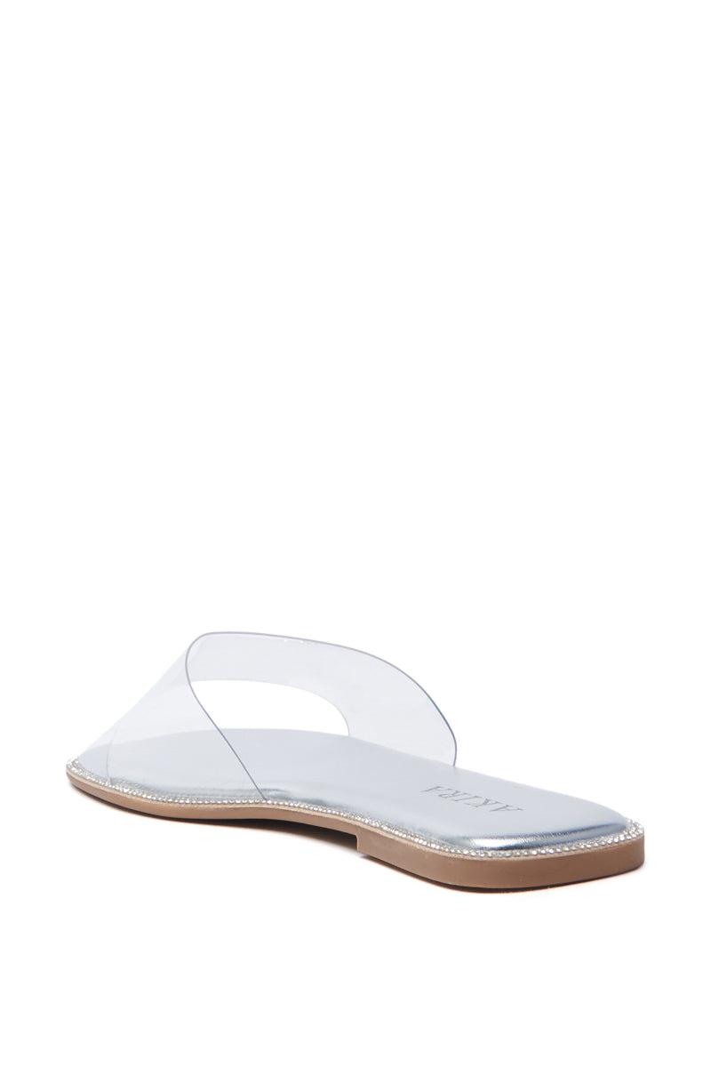 It’s clear as day: You need The AZALEA WANG Bennu Silver Clear PVC Flat Sandal in your life. This trendy slide is crafted from a metallic, faux leather upper and features an open square toe silhouette, a flat sole with glittering rhinestone embellished trim, and a wide, translucent PVC foot band. Complete with a short chunky heel, a cushioned insole, and a slip-on fit. Pair with anything from mini skirts to denim to bring on the glam and glitz. (all measurements approximate from size 7.5)- PCV and Faux Leather Upper- Open Square Toe- Flat Sole- Short Chunky Heel- 0.25” Heel Height- Imported Product ID: 1024619