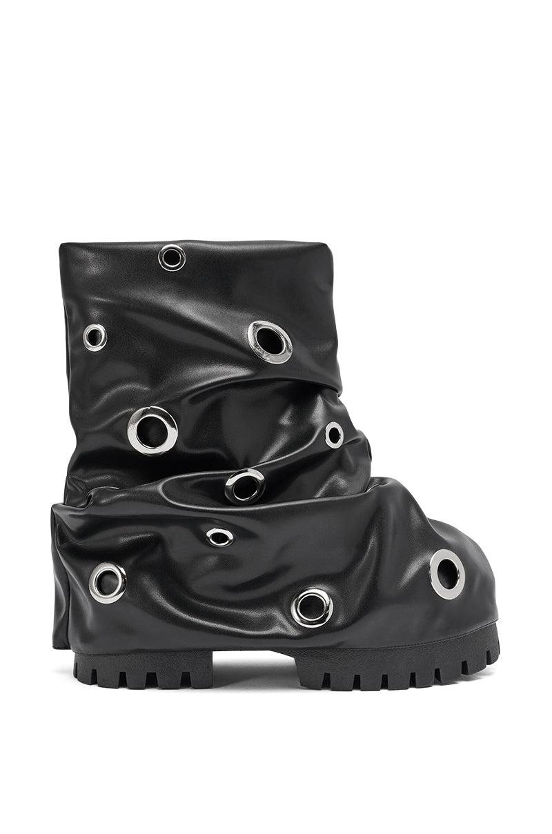 Rock grommets, grunge, and glam with the AKIRA GOLD Fable Black Grommet Embellished Flat Bootie. This design boasts a mid calf faux leather shaft with a foldover layer, lug platform sole and chunky heel, and silver metallic grommet accents. Style with tights and a mini skirt for any night out!- PU Upper- Round Toe- Chunky Heel- Lug Sole- Mid-Calf Shaft- Imported(all measurements approximate from size 10)- 2.25” Heel Height- 1.5” Sole Height- 10” Shaft Height- 15.5” Shaft Opening CircumferenceProduct ID: 1085981