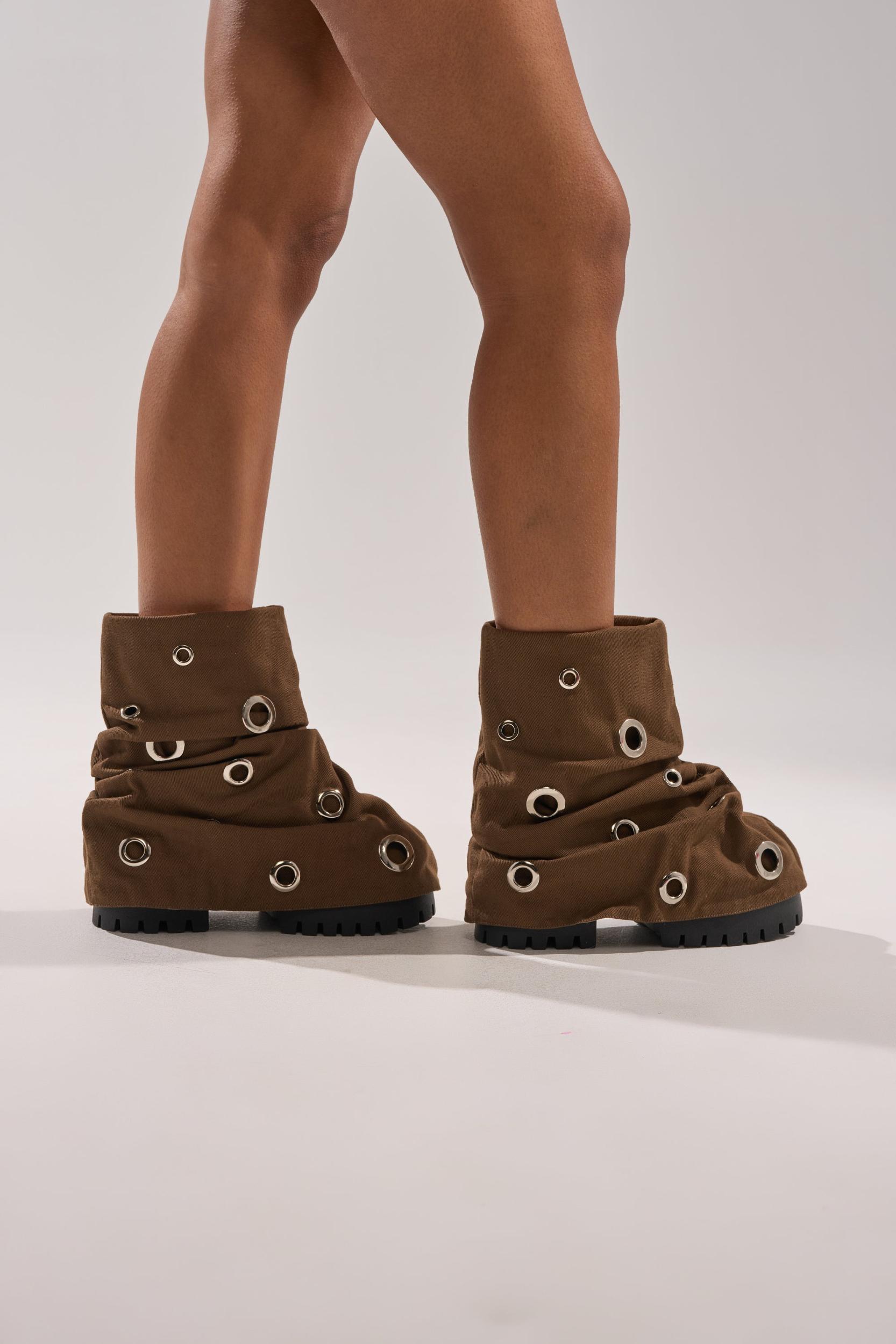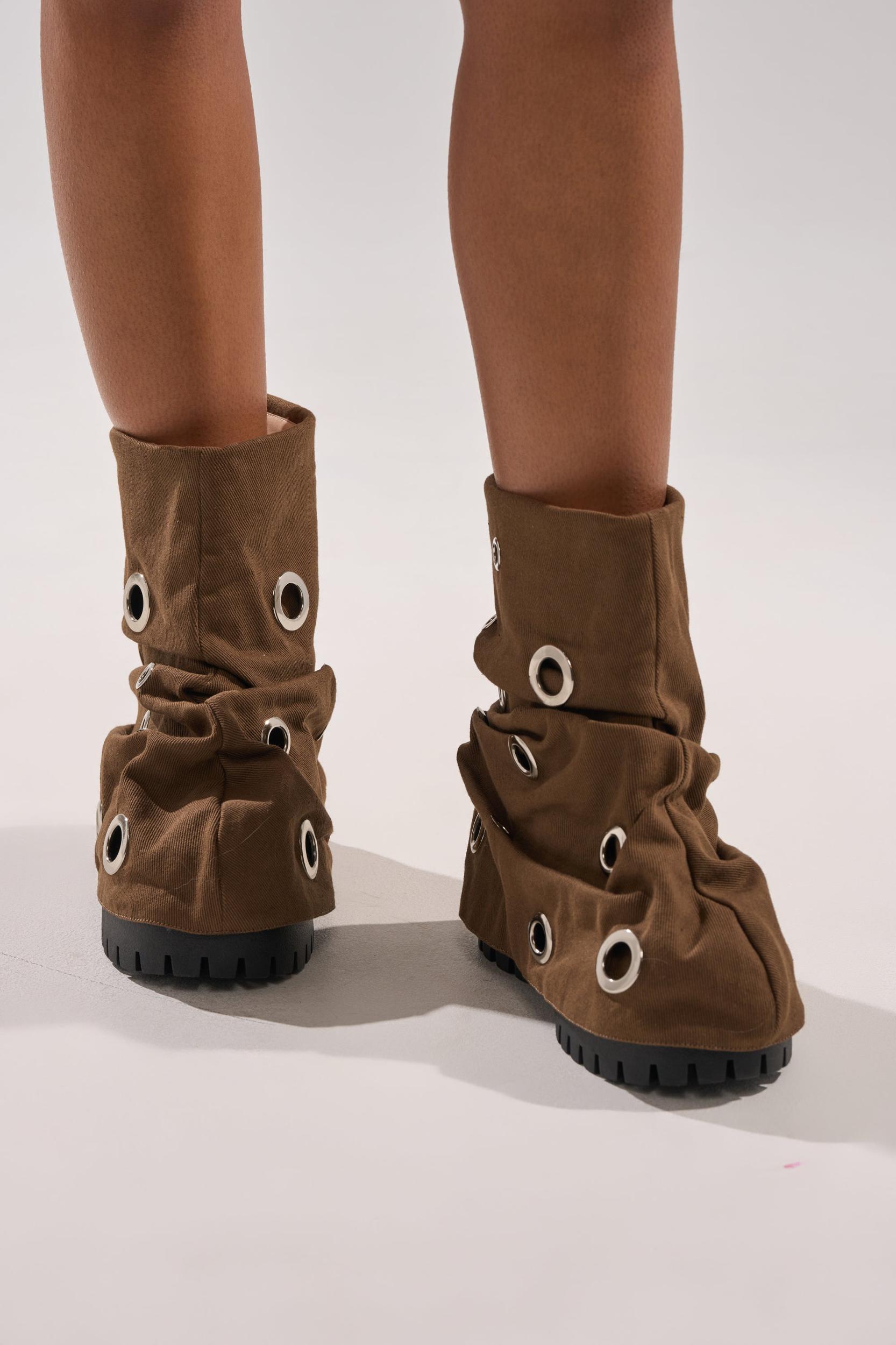 The AKIRA GOLD Fable Brown Grommet Embellished Flat Bootie is grungy-chic heaven. Crafted from a structured fabric, these baddies boast a slouchy, mid-calf foldover shaft adorned with an assortment of silver grommets, a round toe, a chunky heel, and a coordinating, durable lug sole. Complete with an effortless, pull-on fit. - Textile Upper- Round Toe- Chunky Heel- Lug Sole- Mid-Calf Shaft- Imported (all measurements approximate from size 10)- 2.25” Heel Height- 1.5” Sole Height- 10” Shaft Height- 15.5” Shaft Opening CircumferenceProduct ID: 1085972
