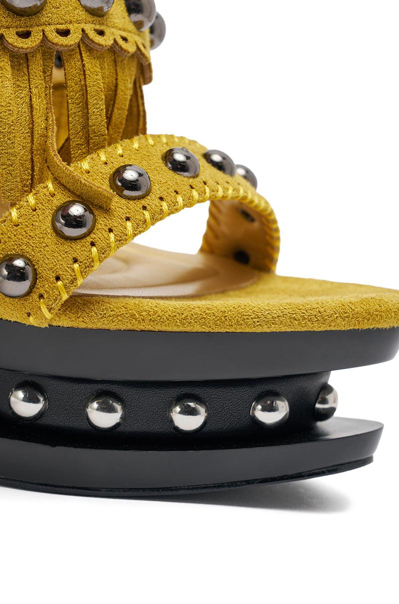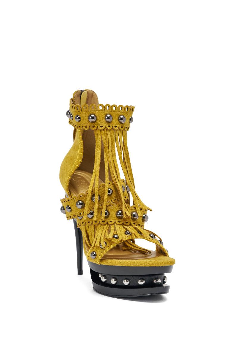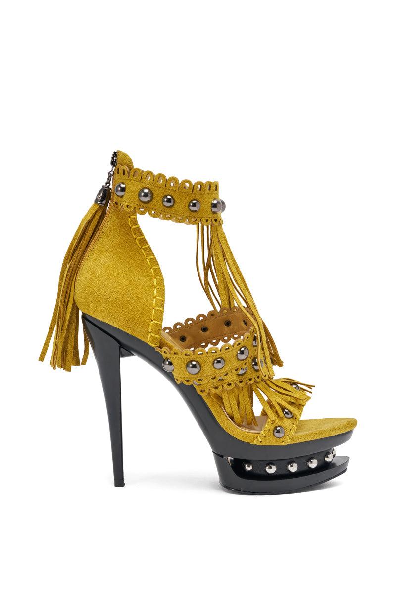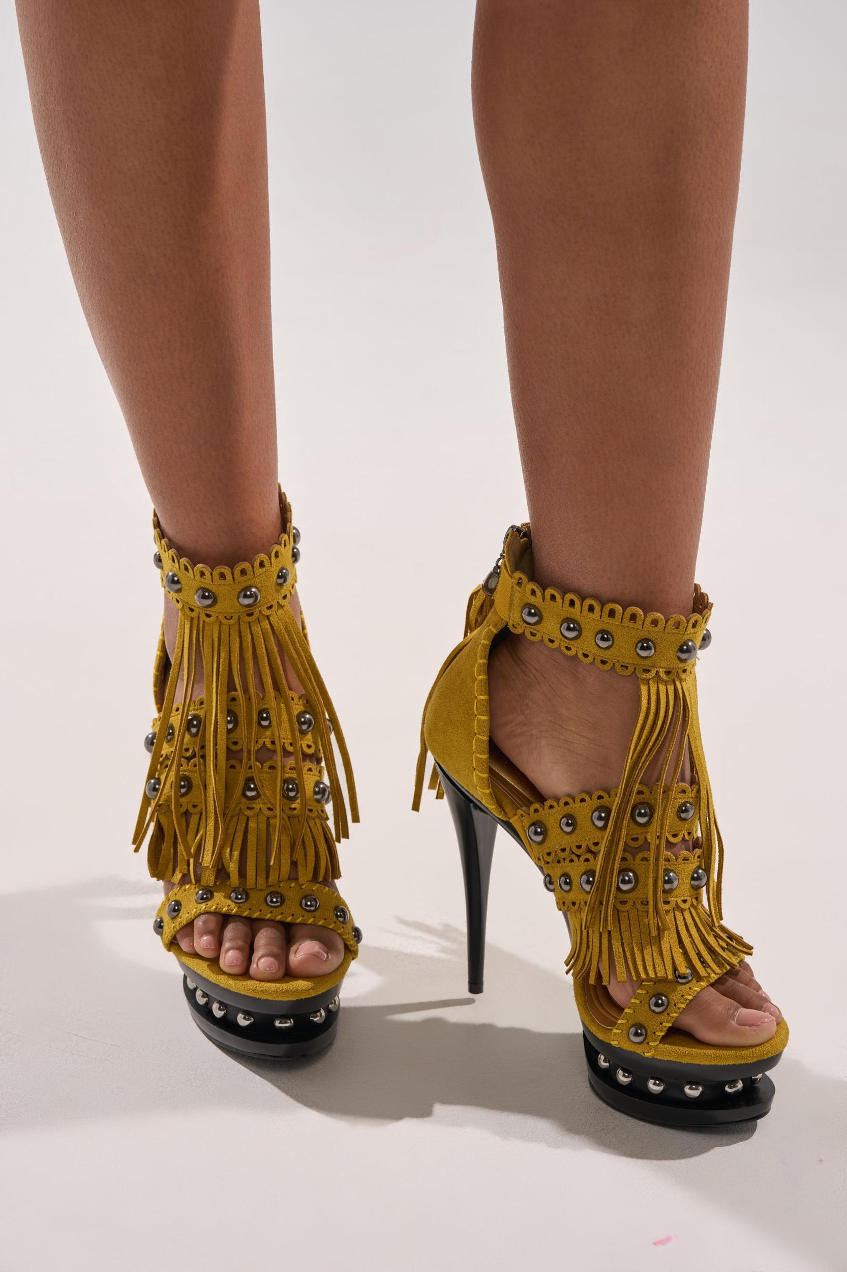 Strut the street like the runway with the AKIRA GOLD Marova Mustard Novelty Platform Fringe Embellished Sandal. This bold mustard-yellow platform stiletto sandal delivers fierce style with its scallop trim straps, stitch detailing, edgy silver studs, and faux suede upper with fringe. Finished with a back zipper enclosure with silver hardware and a tassel, stud detailing in the indented platform, a Comfort Cushion insole, and black glossy finish on the sole and heel, this is the perfect statement piece for any night out. - Faux Suede Upper- Almond Open Toe- Stiletto Heel- Platform Sole- Imported (all measurements approximate from size 10)- 5.5” Heel Height- 1.5” Sole HeightProduct ID: 1089790