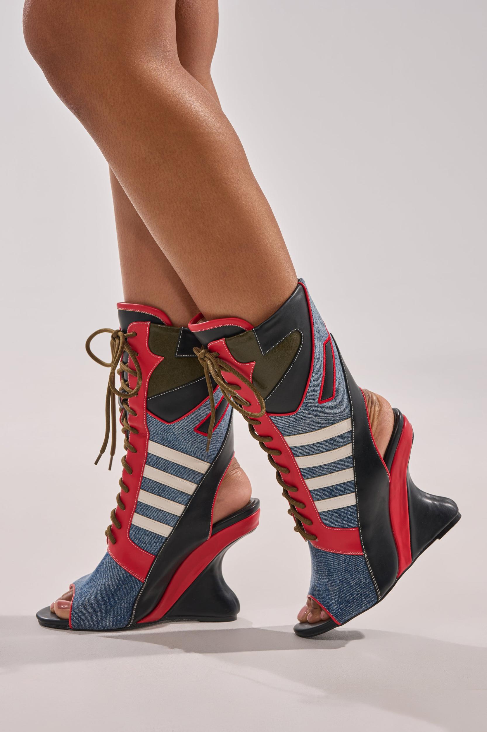 The AKIRA GOLD Mayweather Multi Sport Look Wedge Bootie is crafted from a mix of sleek faux leather and contrast denim panels with a bold color block design. It features an almond peep toe silhouette, an inverted wedge heel, and a mid-calf shaft with sporty striped detailing and a full lace-up front for a customizable fit. Complete with a Comfort Cushion insole, a cut out on the heel, and subtle padding at the shaft opening. Perfect for adding a sporty edge to any ensemble. - Denim Textile & Faux Leather Upper- Open Almond Toe- Inverted Wedge Heel- Mid-Calf Shaft- Imported (all measurements approximate from size 10)- 4.75” Heel Height - 7” Shaft Height- 13” Shaft Opening CircumferenceProduct ID: 1089515