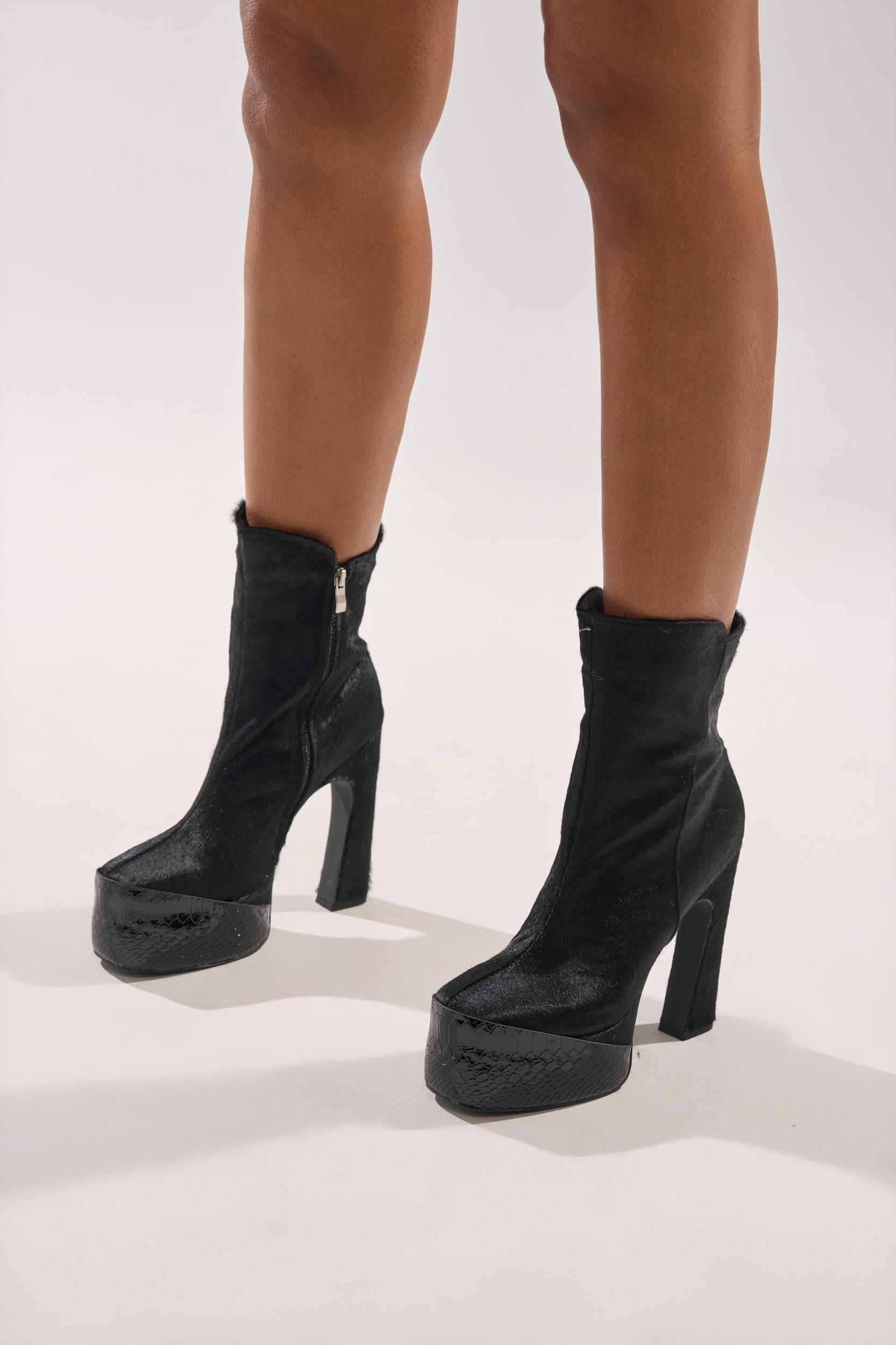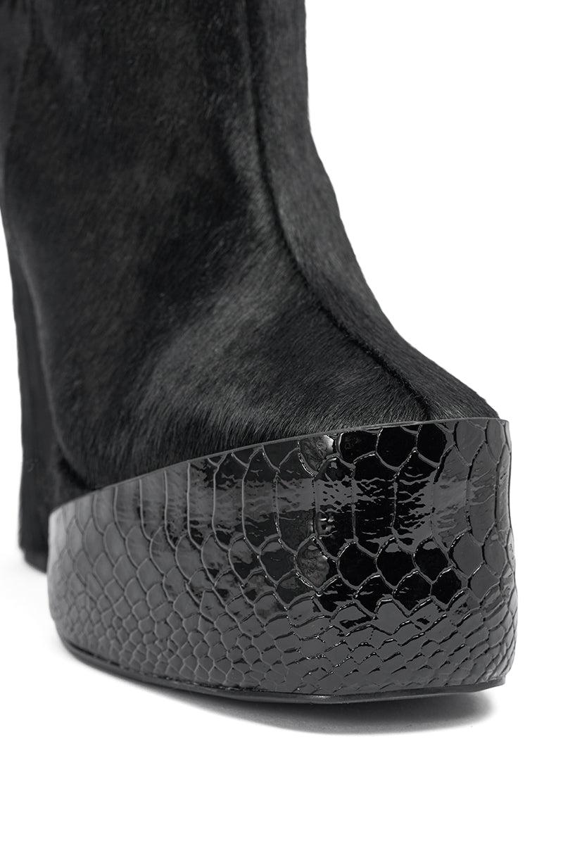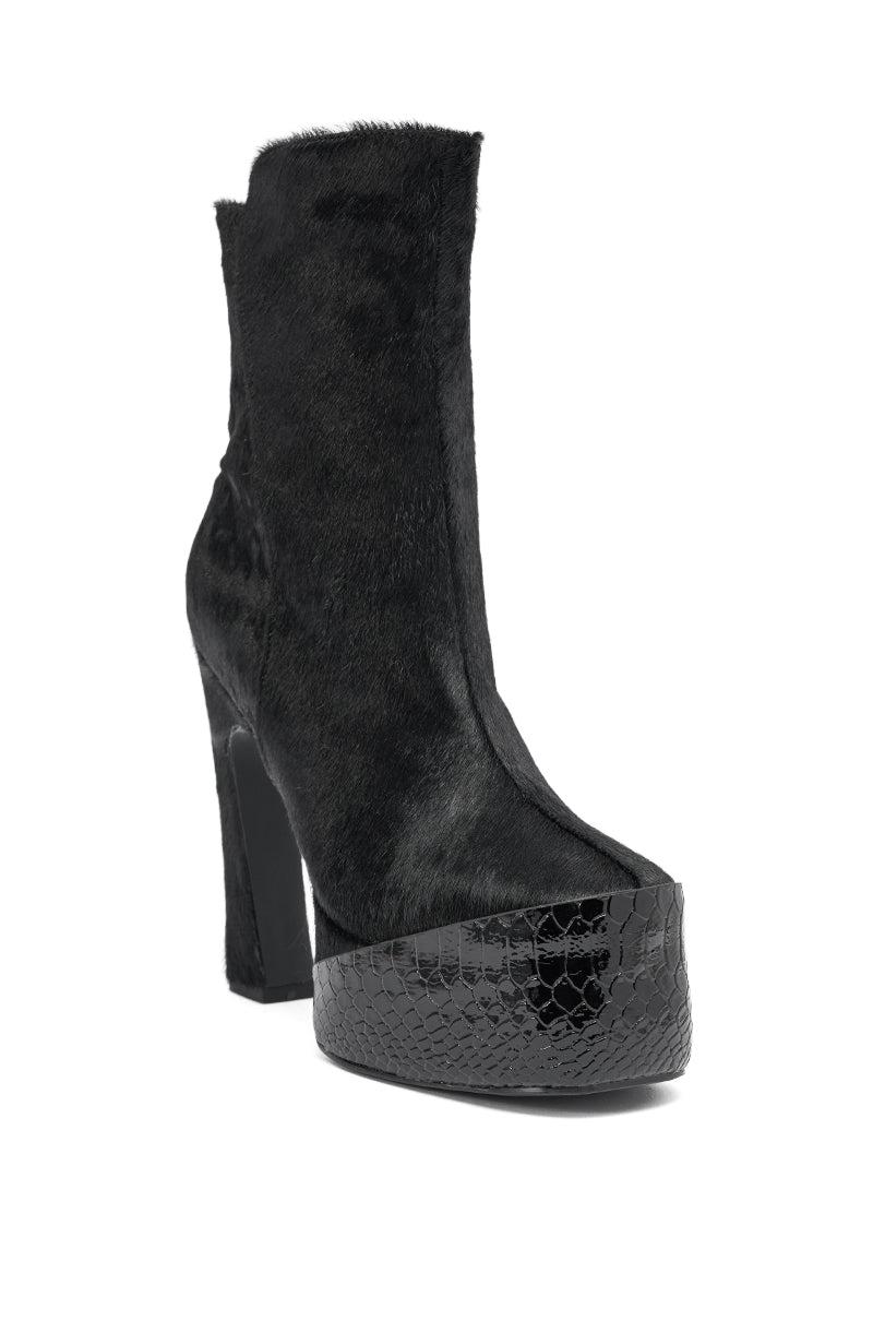 The AKIRA GOLD Trot Black Bootie features a sleek genuine calf hair upper, a sharply sculpted square heel, mid-calf shaft, and a bold elevated platform toe wrapped in a black snake skin finish with a side silver hardware zipper enclosure. Style with a black bodycon maxi for the perfect subtle flair for any occasion. - Genuine Calf Hair Upper- Rounded Square Toe - Square Heel- Platform Sole- Mid-Calf Shaft- No Stretch- Imported (all measurements are approximate from size 7.5)- 5.5” Heel- 2” Sole Height- 6.5” Shaft Height (highest point)- 11” Shaft Opening CircumferenceProduct ID: 1078933