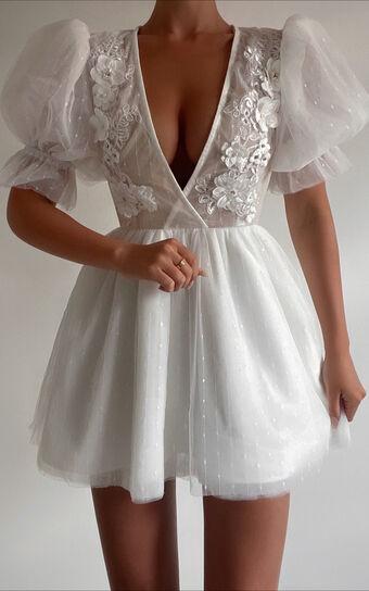 Who said wedding gowns had to be floor-sweeping? We sure didn't! For the brides who aren't a fan of floor-length dresses or just need a dance floor-ready dress to change into for the reception, our Akshia Dress is the one for you! This dreamy mini features a plunge neckline, faux wrap front bodice with floral appliqué, short puff sleeves with ruffle cuffs and a floaty tulle skirt. It's sweet, elegant and so flattering, it'll have you dancing the day or night away - in style.Team it with Kodi Earrings in Gold/Pearl for a classy touch!Product Details Invisible side seam zipper Short puff sleeves with ruffle cuffs Crossover faux wrap bodice with floral appliquéPlunge necklinePuffy tulle mini skirt Fit & flare silhouette Spot detailing on fabricBuilt-in nude cami in bodice Fully lined in front bodice and skirt No pocketsSize & FitMeasurements are referring to AU sizes - Please use the conversion chart here to find your size Dress length| 6: 80.4cm | 8: 81cm| 10: 82.2cm | 12: 83.4cm | 14: 84.6cm | 16: 86.4cm | 18: 88.2cm | 20: 90cmBust | 6: 77.6cm | 8: 80cm | 10: 85cm | 12: 90cm | 14: 95cm | 16: 102cm | 18: 109cm | 20: 114.25cm Waist (on seam) | 6: 62cm | 8: 67cm | 10: 72cm | 12: 77cm | 14: 82cm | 16: 89cm | 18: 96cm | 20: 103cm Studio model is wearing size S / 8 AU / 4 US / 8 UK / 36 EU Studio model's height is 177cm / 5'9.5"Material & Care Made with 100% nylon, low stretch Wash with similar colours, wash inside out, cool iron if required, iron on reverse side