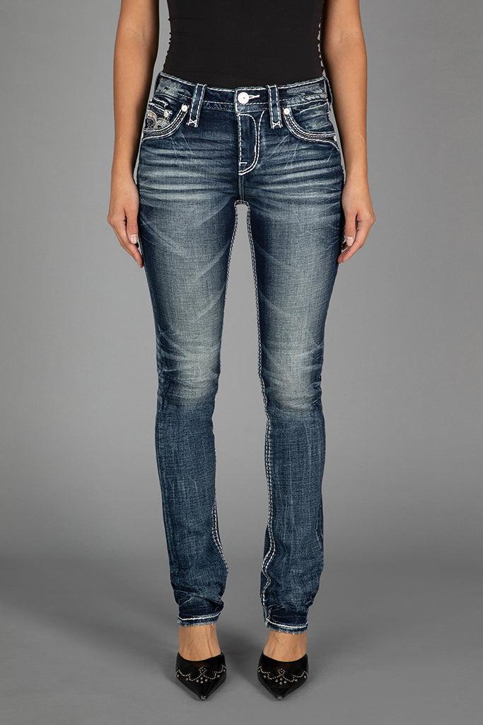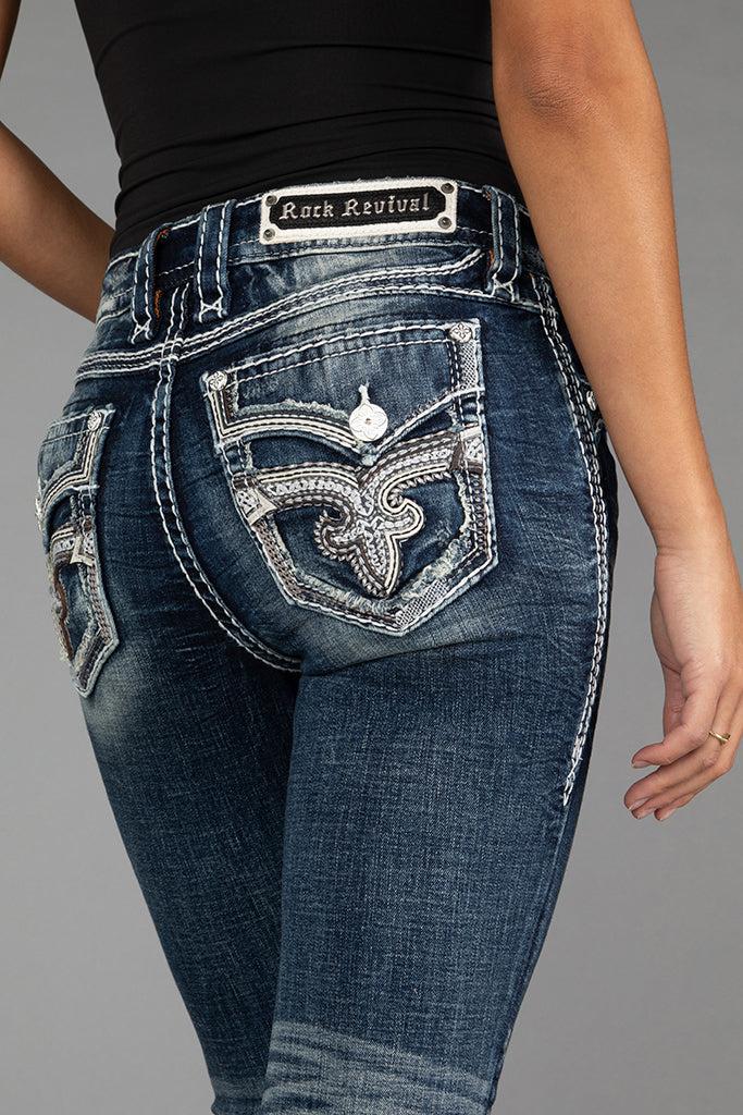 Alaia Straight Jeans by Rock Revival with a straight silhouette crafted in a dark wash, designed in Los Angeles. Premium stretch denim for comfort and durability Signature inverted Fleur-de-Lis embroidery Custom pewter hardware and rivets Engraved 'Rock Revival' leather waist patch