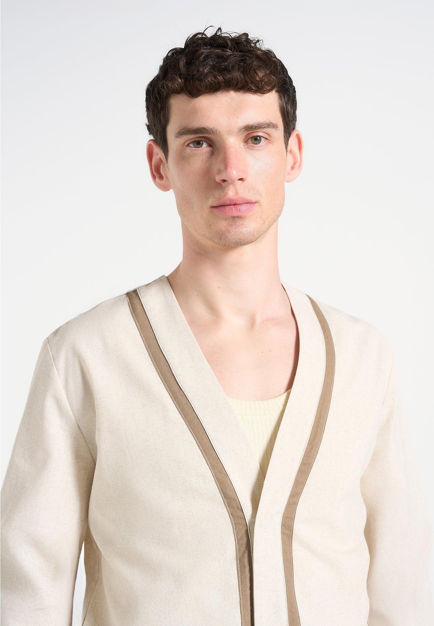 Blending lightweight tailoring effortlessly, the Linen Cardigan With Contrast Placket reinterprets layering through a clean, collarless silhouette and tonal contrast trim. The wide placket detailing runs uninterrupted through the front, anchored by a concealed button fastening that preserves its minimal aesthetic. Crafted in breathable linen, it’s ideal for transitional wear with elevated intent. Contrast Edge Binding for Structured Framing Breathable Linen Fabric with Natural Texture Concealed Button Fastening for Seamless Front Deep V-Cut Neckline for Open-Front Aesthetic Straight Hemline with Extended Placket Detail Silver Manière De Voir Eiffel Plaque on Back 30% Linen, 70% Viscose / 30% Linen, 70% ViscoseAlways check the care label for wash instructions.