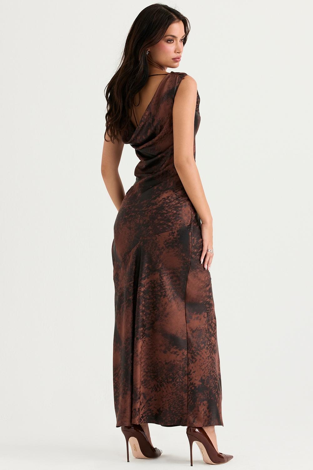 Beautifully cut on the bias and thoughtfully crafted, 'Alaina' is delicately cut from our luxuriously soft satin in an antique copper hue to take you into the autumnal season and beyond. We love the flattering draped neckline that can be worn on or off the shoulders and mirrors the cowl back beautifully with slender ties for the perfect fit.