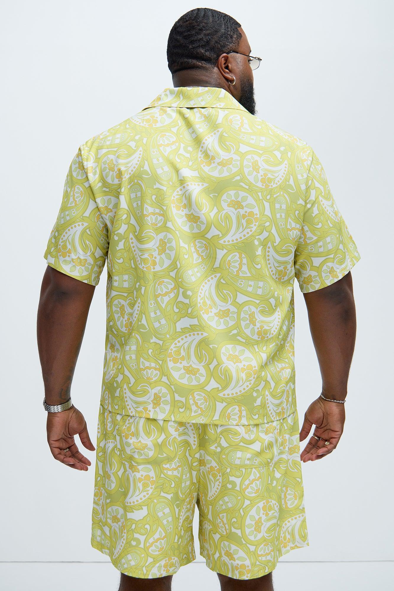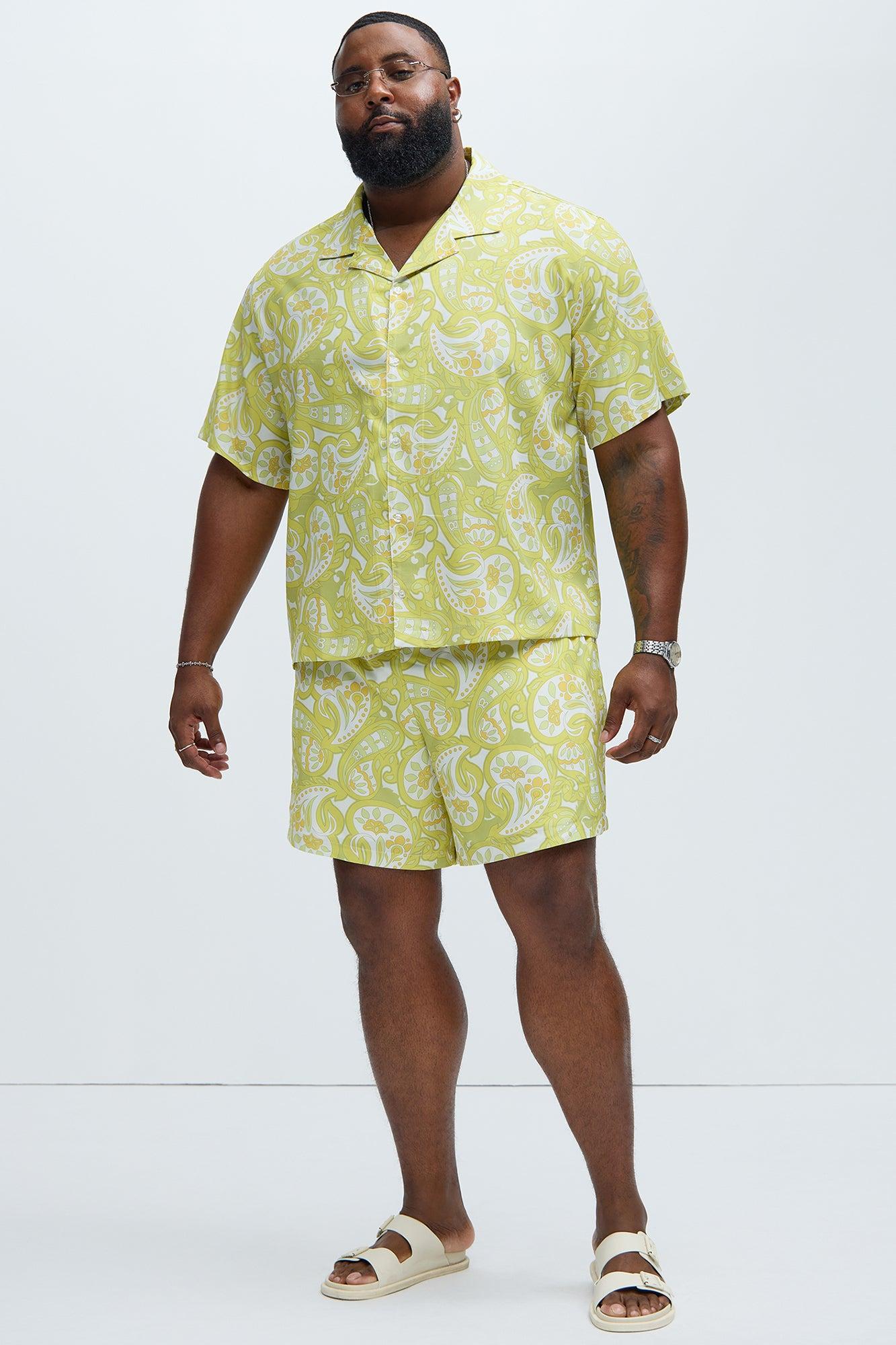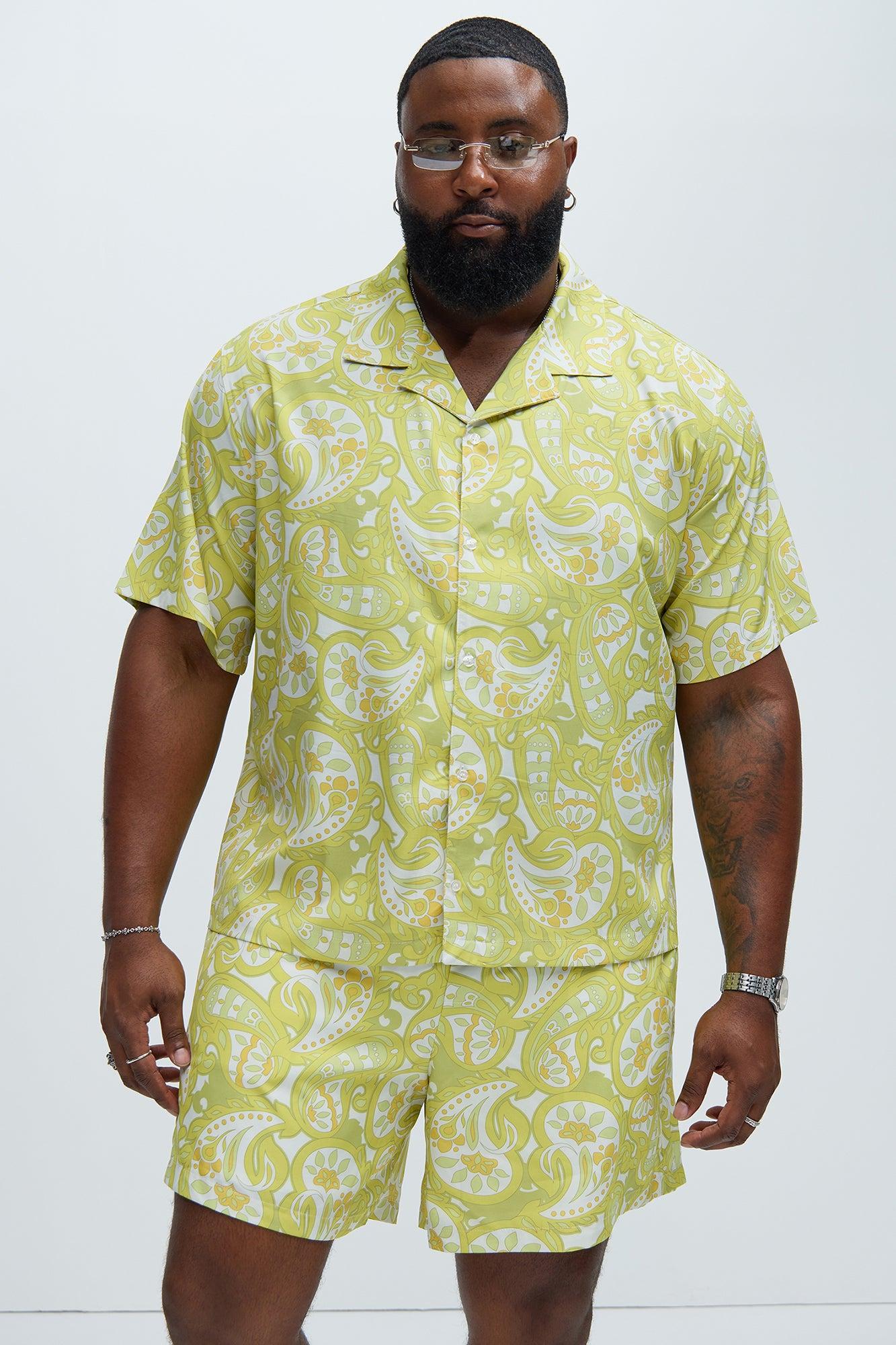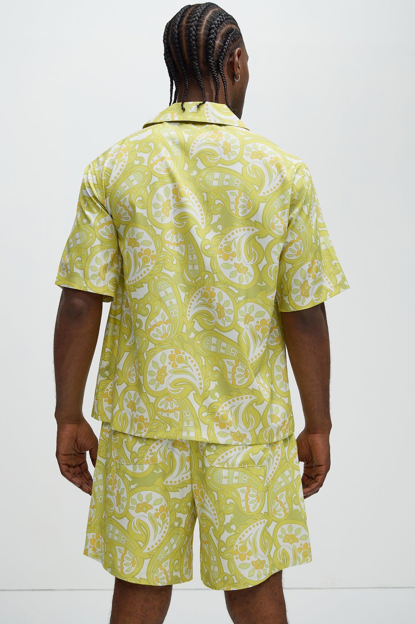 Available In Yellow. Fold Down Collar Front Button Closure Short Sleeve Pair With "Alameda Paisley Warm Up Shorts" Shell: 92% Polyester 8% Spandex Imported California Proposition 65 WARNING: Cancer and Reproductive Harm - www.P65Warnings.ca.gov.