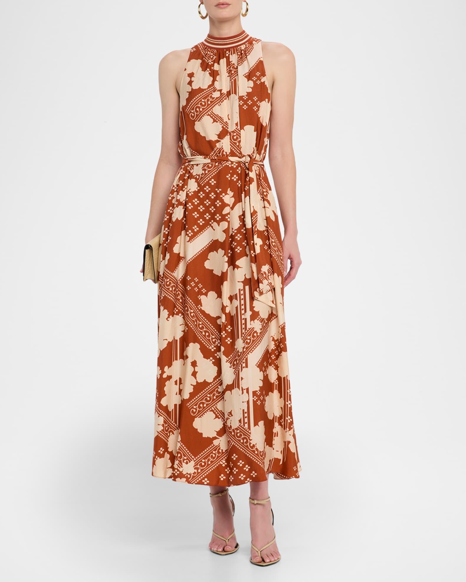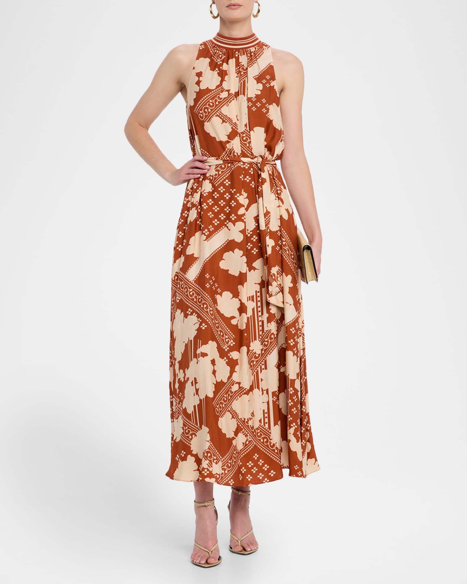 Illustrated with a multi-pattern floral print, the Alana dress by Ramy Brook consists of a blouson bodice that flows into a relaxed skirt for an effortless, feminine look Approx. 50"L from shoulder to hem High neckline Sleeveless Self-tie sash belt Side seam pockets Full length A-line silhouette Hook-and-eye closure behind the neck Rayon/cellulose acetate Lining: Polyester Dry clean Imported