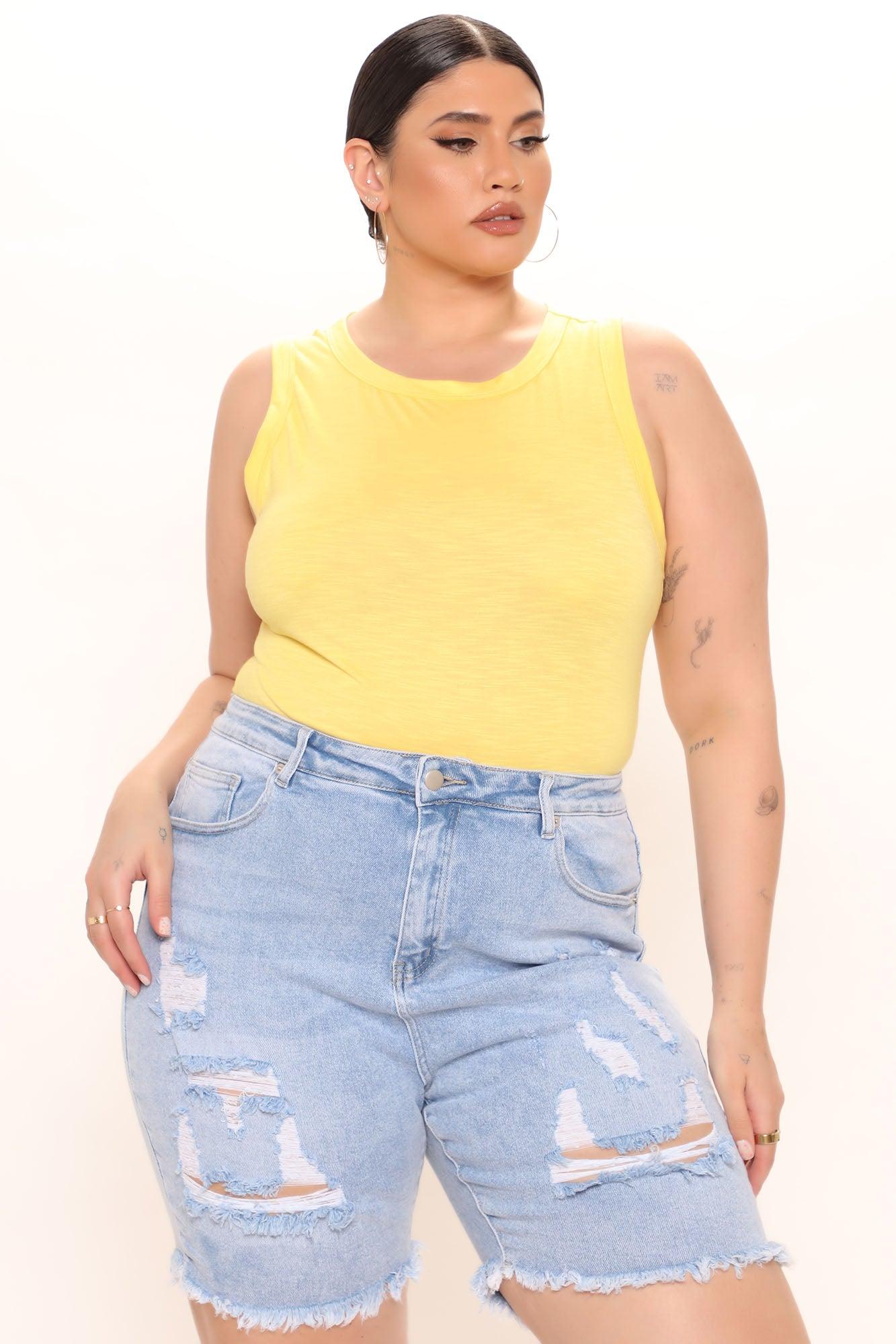 Available In Brown, Taupe, Pink, Yellow, And Lime. Sleeveless Bodysuit Crew Neck Slub Jersey Cheeky Bottom Snap Button Closure Stretch Final Sale 95% Polyester 5% Elastane California Proposition 65 WARNING: Cancer and Reproductive Harm - www.P65Warnings.ca.gov.