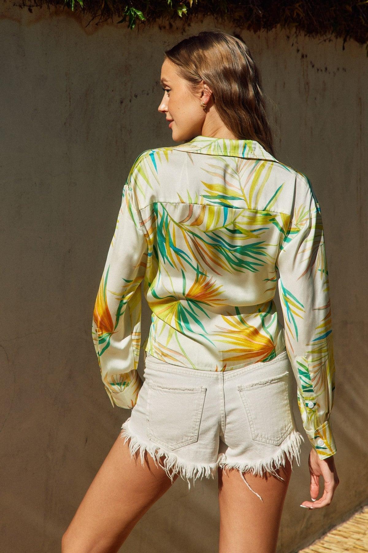 Introducing the Alana Tropical Palm Leaf Top, perfect for those seeking a casual yet stylish look. This top features a tropical palm leaf print, collared neckline, long sleeves, and a plunging neckline. The model is 5'10" and wearing a size Small, making it versatile for all body types. Stay on trend with this must-have piece!