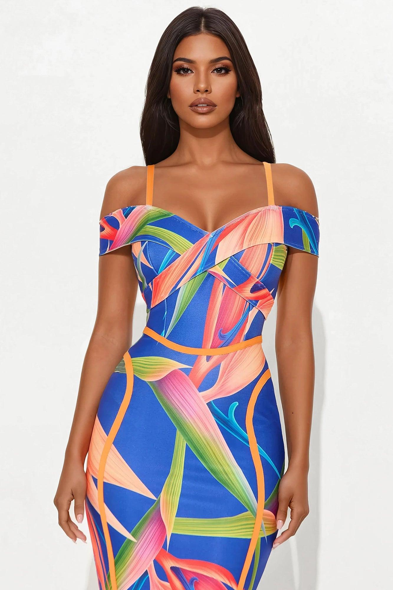 Available In Orange/combo. Bandage Midi Dress V- Neck Adjustable Spaghetti Straps Cold Shoulder Contrast Trim Back Zipper Stretch Length Measured Flat = 39" Disclaimer: Print Placement May Vary 90% Polyester 10% Spandex Imported California Proposition 65WARNING: Cancer and Reproductive Harm - www.P65Warnings.ca.gov.