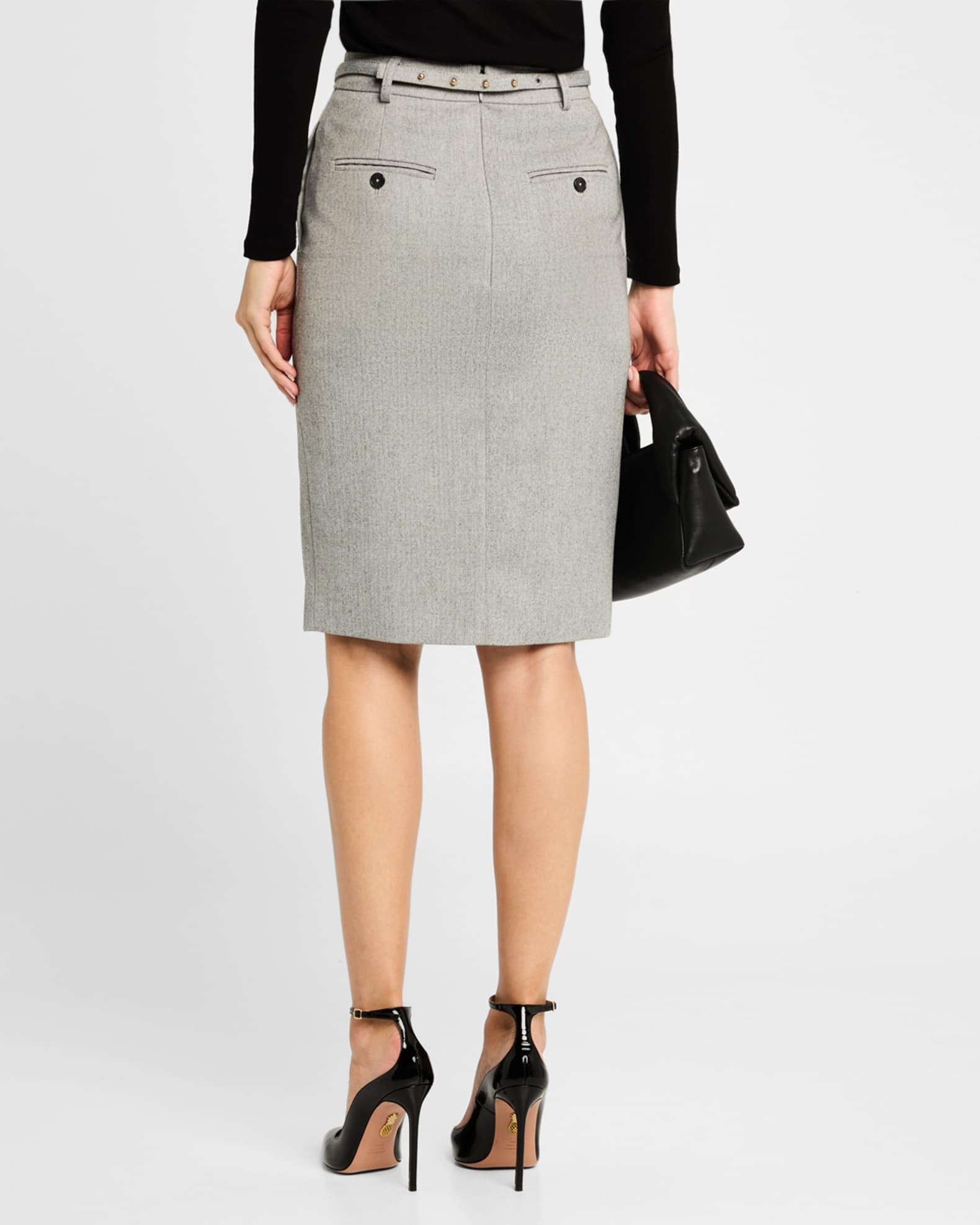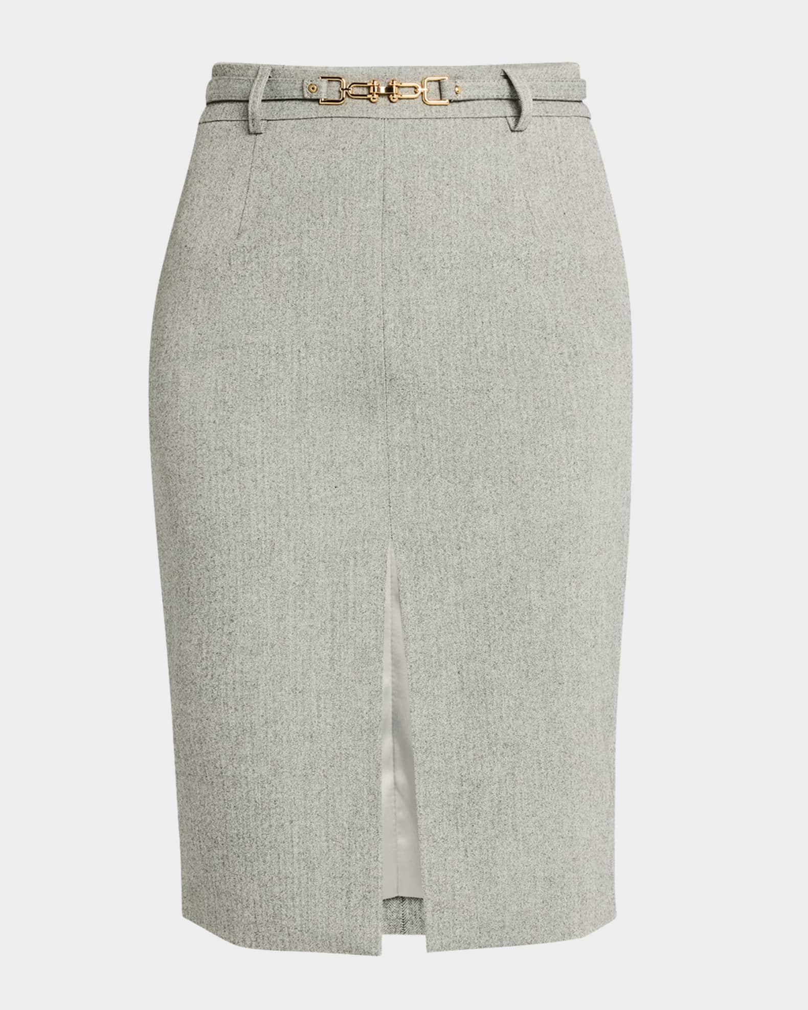 Generation Love "Alayna" twill suiting skirt featuring a matching belt finished with gold-tone hardware High rise Four-pocket style Pencil style Center front slit; approx. 11"L Invisible back zip Polyester/Proviscose® rayon/elastane Lining: Satin Trim: Metal Machine wash cold, line dry Remove the belt before washing Imported Model is 5'10"/177cm.