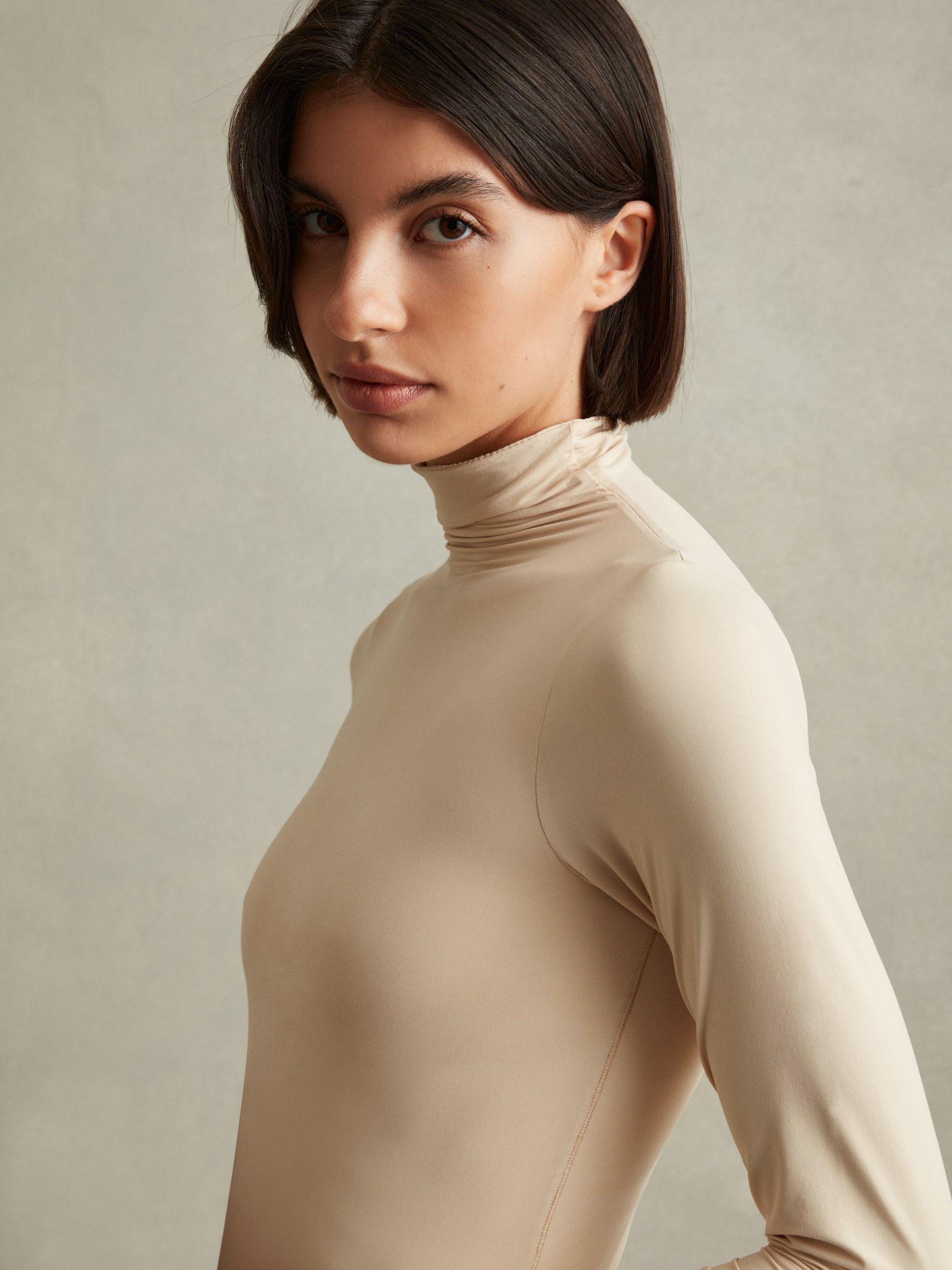 Engineered for comfortable layering, the Alba funnel-neck bodysuit has a seamless skin-like finish and a press-stud thong-back gusset. Seamless construction. Funnel neckline. Press-stud gusset. The model is wearing a size 8. Measurements of model: 5ft9/175cm.