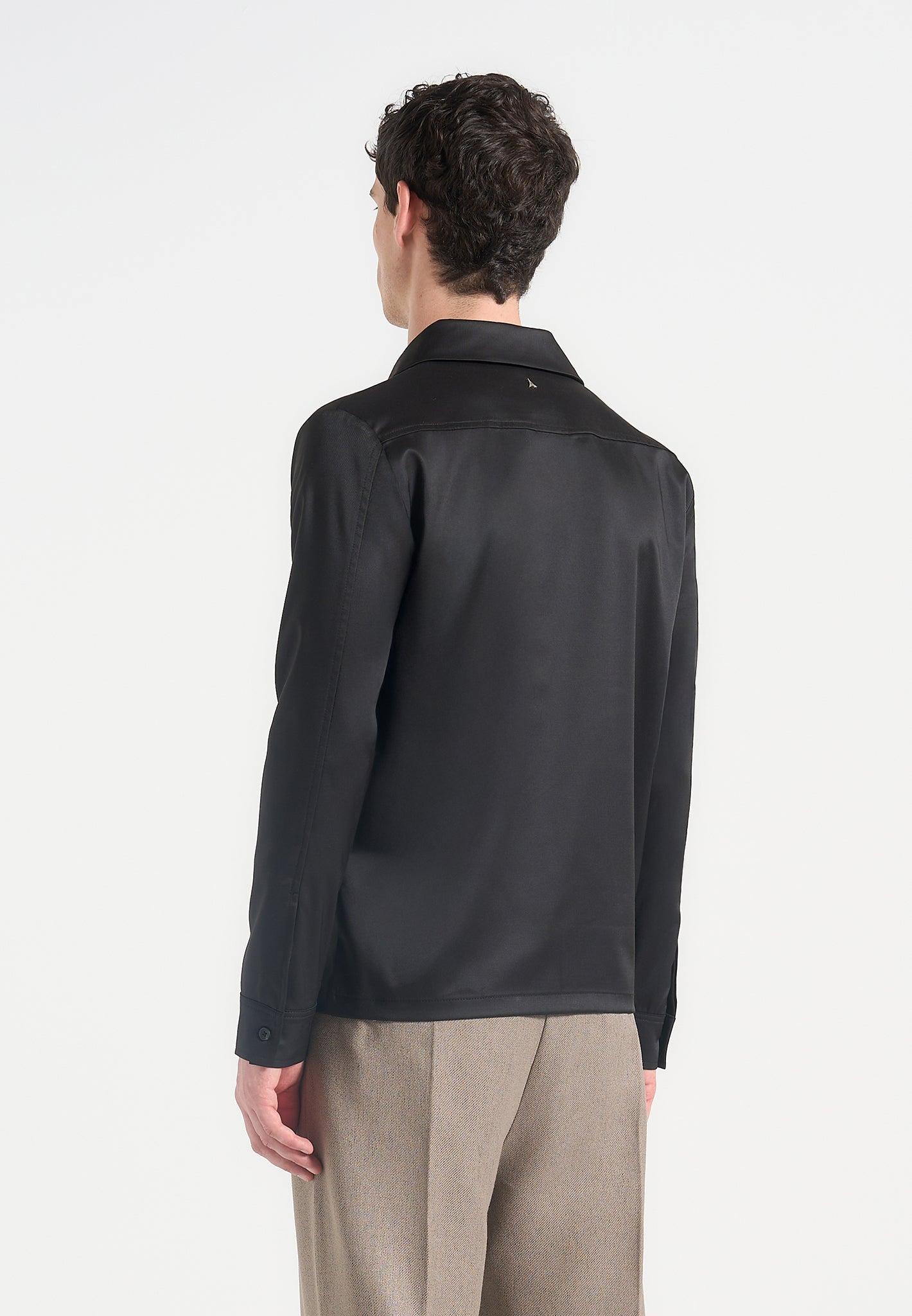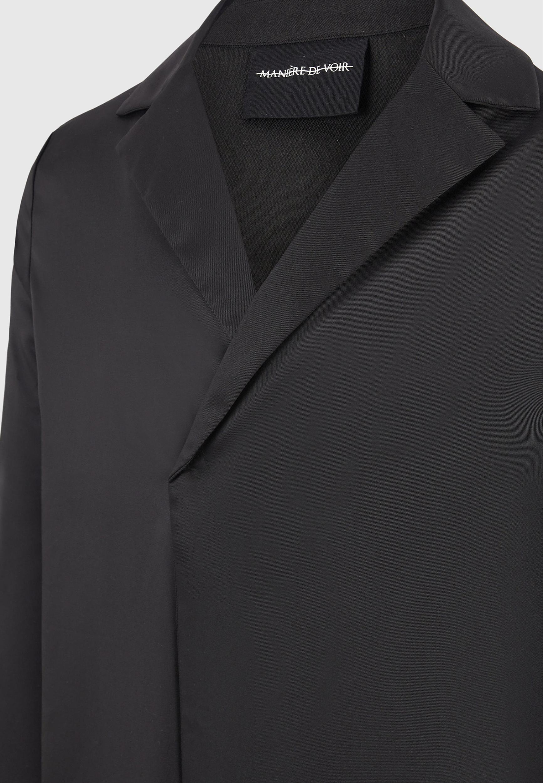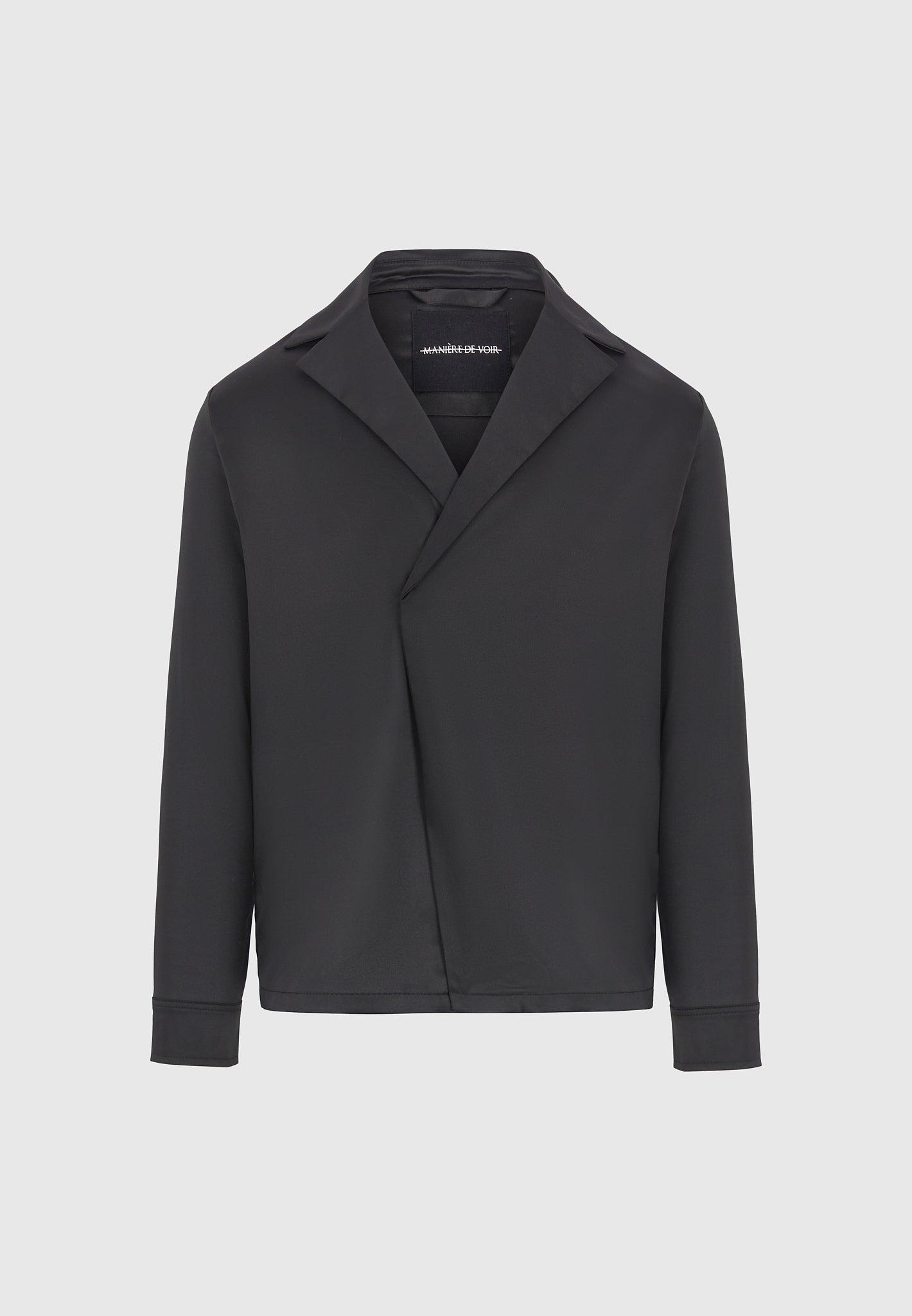 Tailored with intention and asymmetry, the Satin Double Breasted Shirt reframes classic shirting through directional closure and a fluid drape. Crafted from a smooth satin with structured weight, the design wraps across the body with a clean, concealed fastening, offering a subtle take on luxury minimalism with an architectural edge. Asymmetric Double-Breasted Front for Sculptural Silhouette Smooth Satin Fabrication with Soft Sheen Concealed Closure for Seamless Front Profile Relaxed Fit with Lightly Dropped Shoulders Sharp Open Lapel Collar for Modern Framing Silver Manière De Voir Eiffel Plaque on Back 83% Polyester, 15% Rayon, 2% ElastaneAlways check the care label for wash instructions.