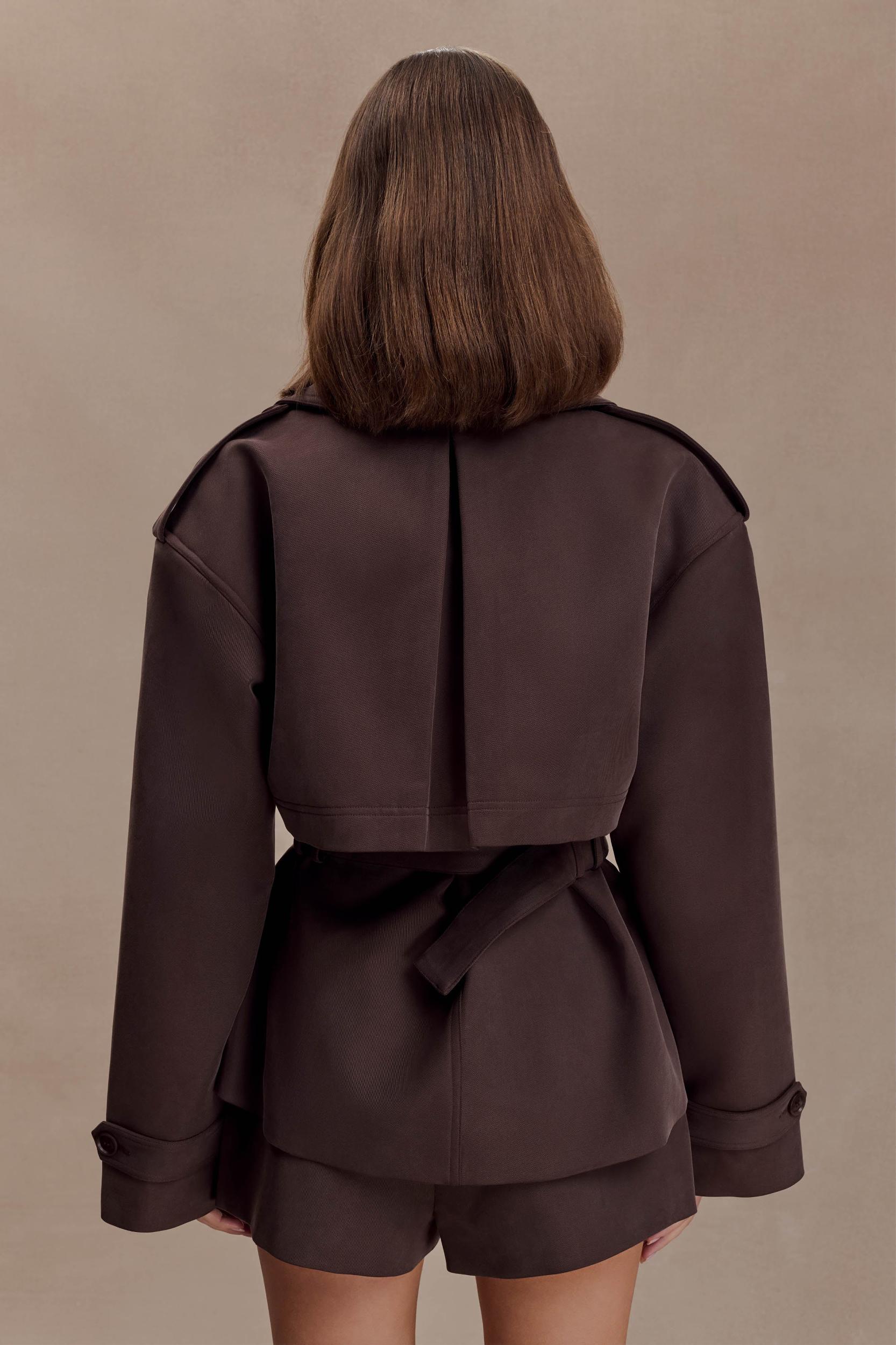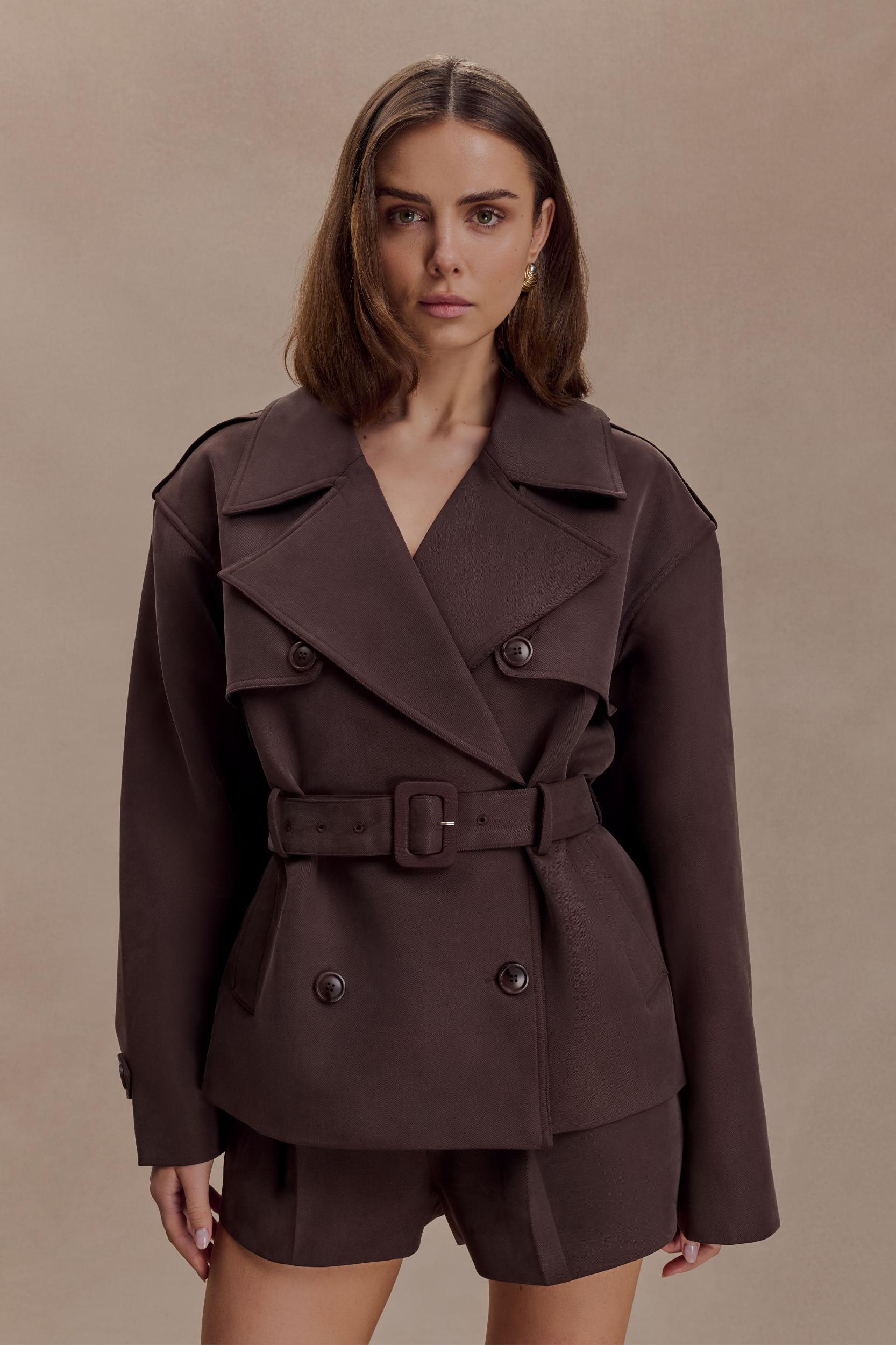 Tailored for the itinerary. The ALDEN Short Trench Jacket offers a contemporary take on timeless outerwear. Designed with classic trench elements including shoulder epaulettes, raglan sleeves, a double breasted front, and a waist cinching belt, this cropped silhouette brings effortless polish to any look. Fully lined for comfort and structure, it features practical side pockets and functional belt loops for added versatility.