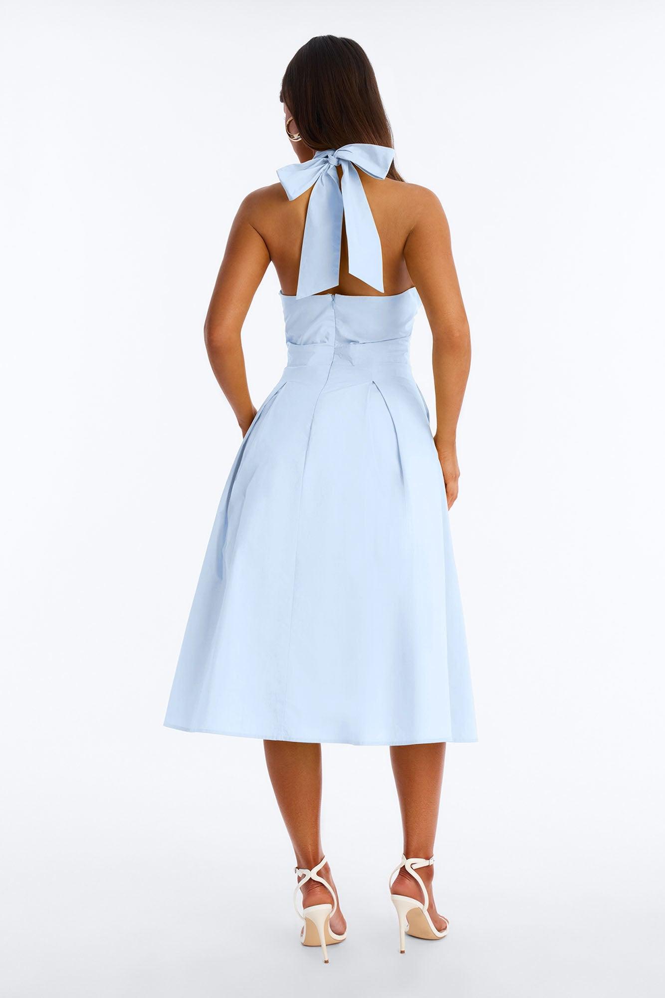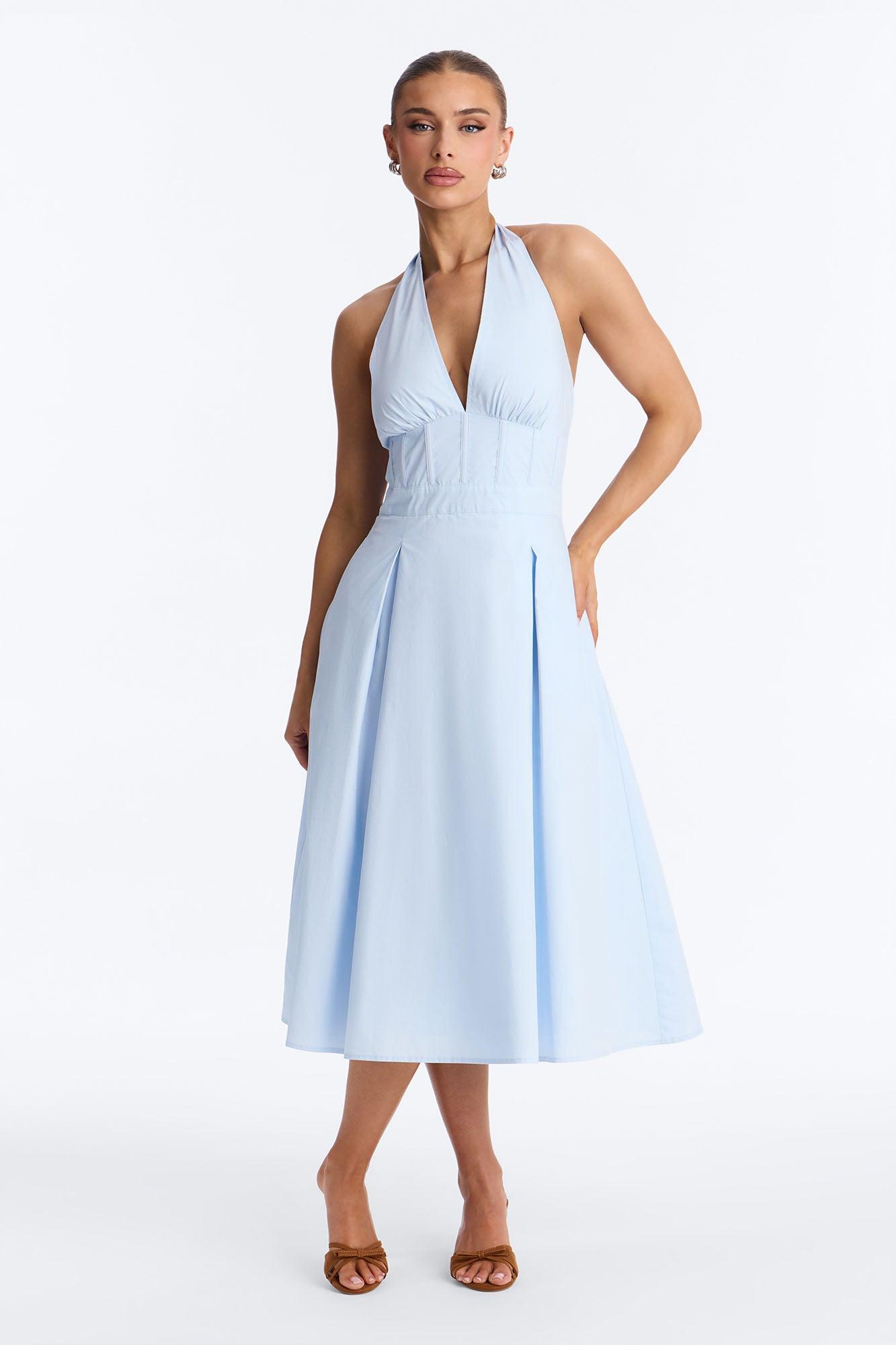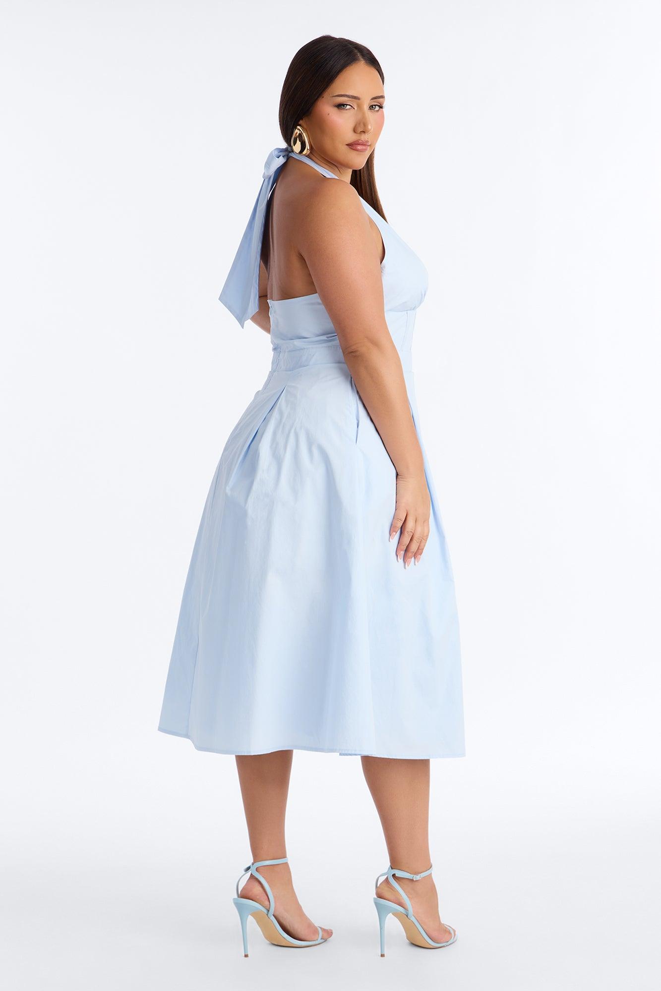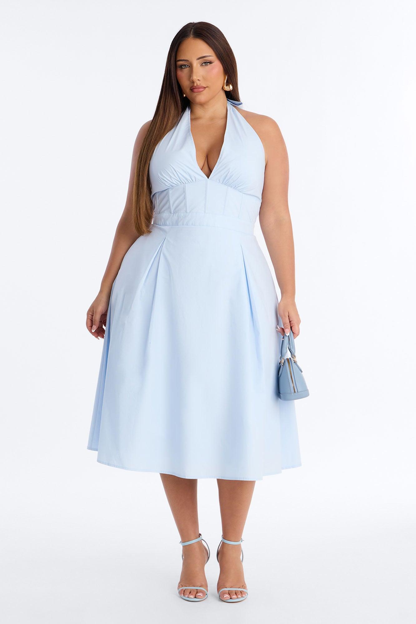 Available In Black, SkyBlue And Yellow. Midi Dress Deep V-Neckline Tie Halter Corset Waist Pleated Hidden Back Zipper Lined Non Stretch Length Measured Flat = 45" Shell: 100% Cotton Contrast/Lining: 100% Polyester Imported Available In Plus Sizes