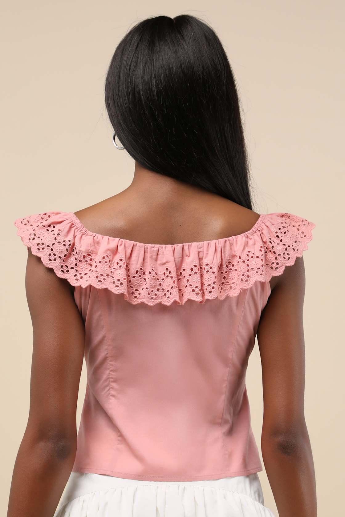 It doesn't get much sweeter than a warm day spent basking in this darling top, crafted from lightweight woven fabric with a fitted silhouette. Ruffly eyelet embroidery trims the neckline that can be worn on or off the shoulders, while a center tying detail tops a partial button placket that creates a flirty front slit.