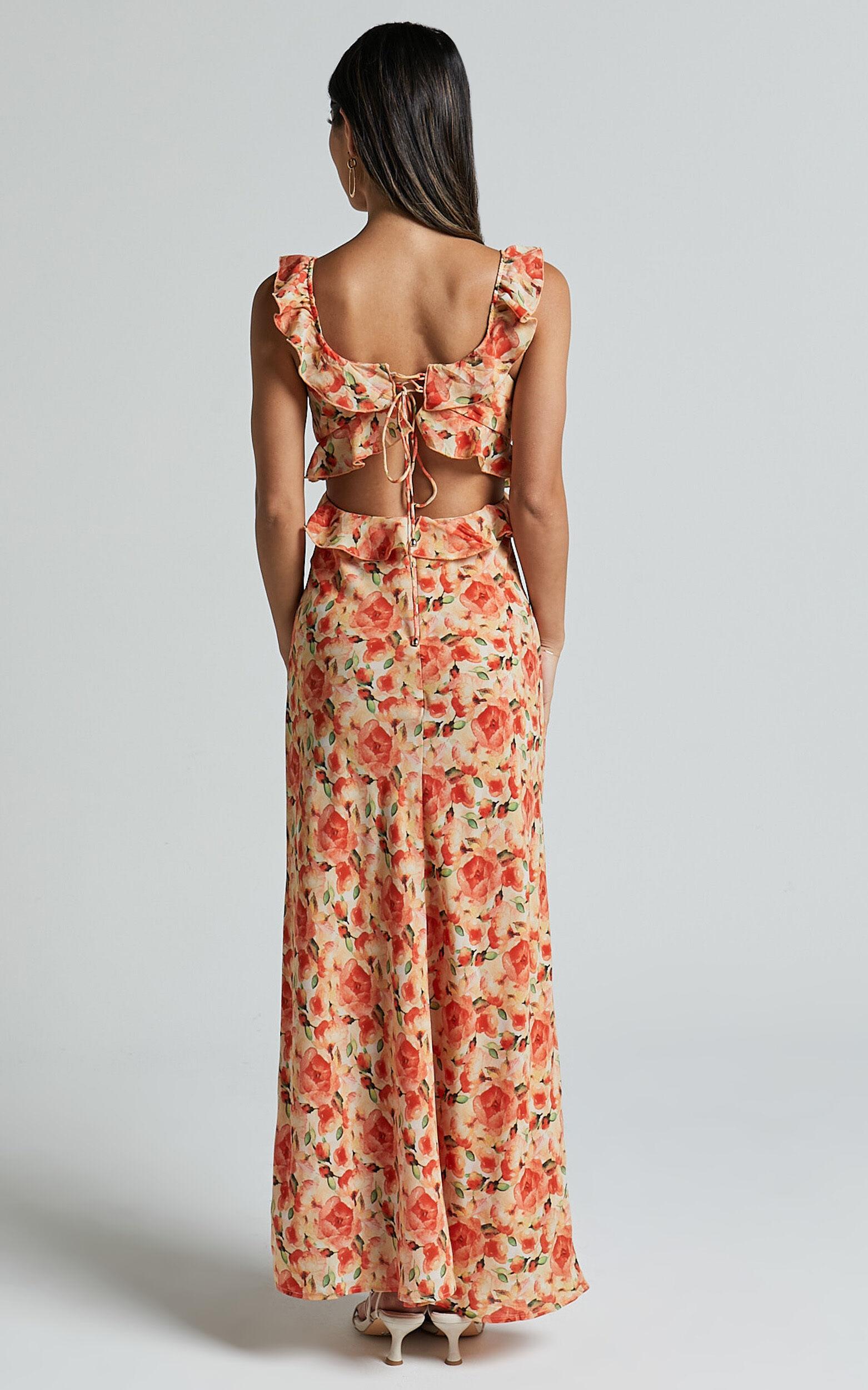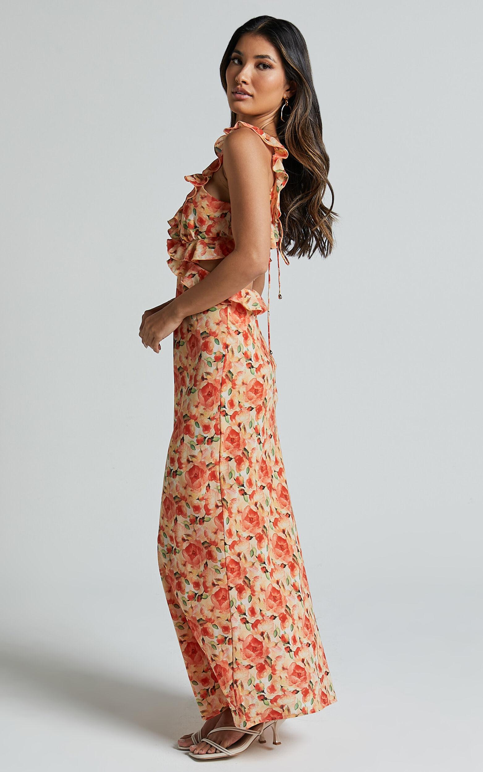 Make a statement in the Alessa Maxi Dress - V Neck Frill Detail Empire Waist Back Cut Out Dress In Peach Floral. This stunning cocktail dress features a plunging V neckline and frill detailing, adding an extra touch of femininity to your look. The empire waist creates a flattering silhouette, while the back cut out adds a hint of allure. Made from georgette and polyester, this midi dress is lightweight and comfortable for all-day wear. Whether you're attending a wedding or going out for drinks with friends, this sleeveless orange floral dress is sure to turn heads wherever you go. Embrace your confidence and show off your unique style with the Alessa Maxi Dress from Showpo.Product Details:Georgette fabricPlunge necklineMaxi length cocktail dressSleeveless styleMade of polyester material.Size and FitSize S / 8 length: 97.5cm / 38.39inMaterial and Care100% PolyesterLow / No stretch