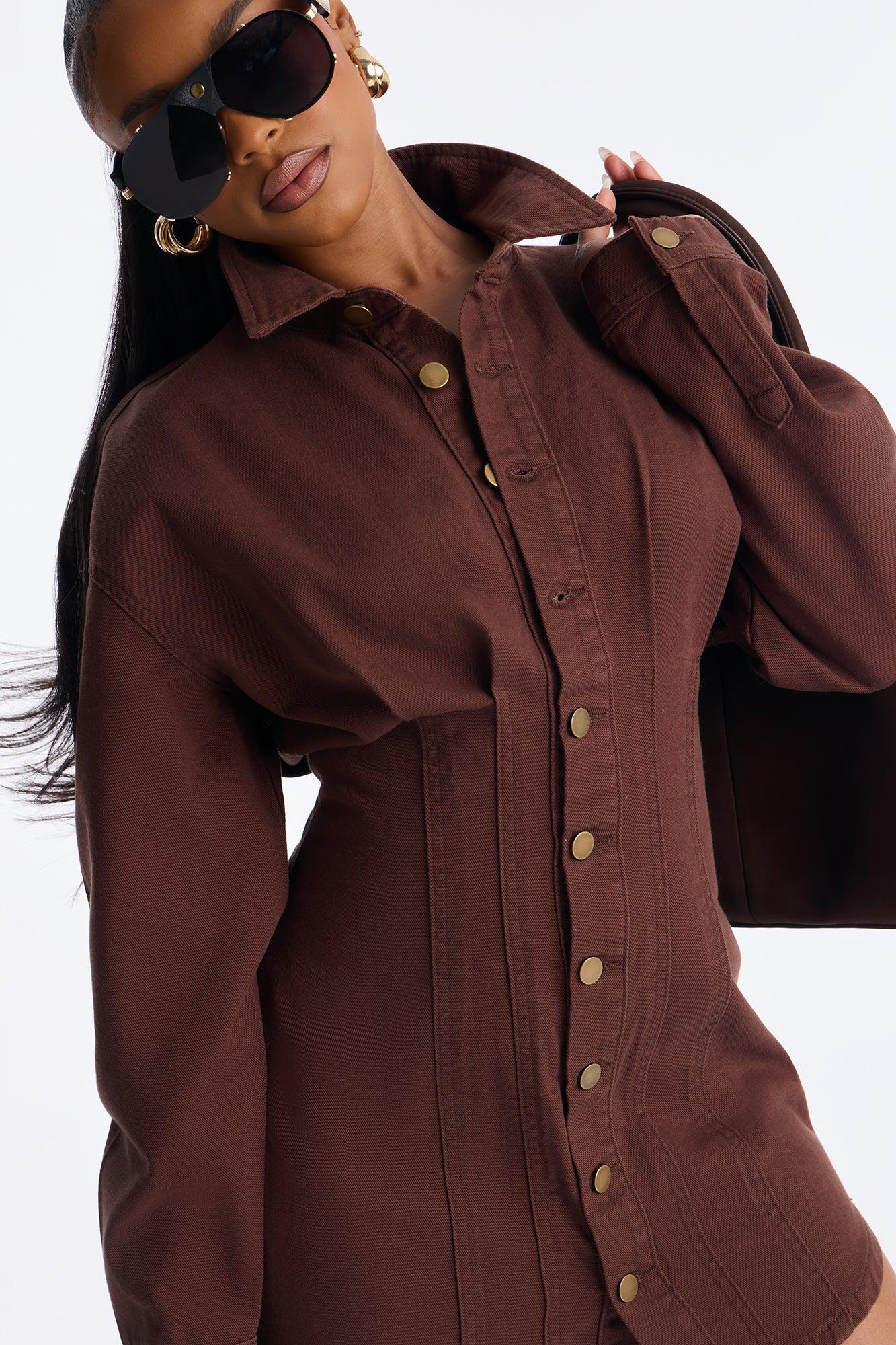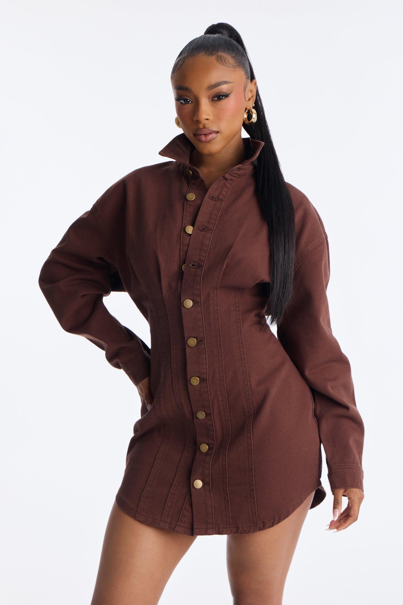 Available In Chocolate, Medium Wash And White. Denim Mini Dress Collar Neckline Long Sleeves Button Front Seam Detail Length = 33" Self: 100% Cotton Imported California Proposition 65WARNING: Cancer and Reproductive Harm - www.P65Warnings.ca.gov.