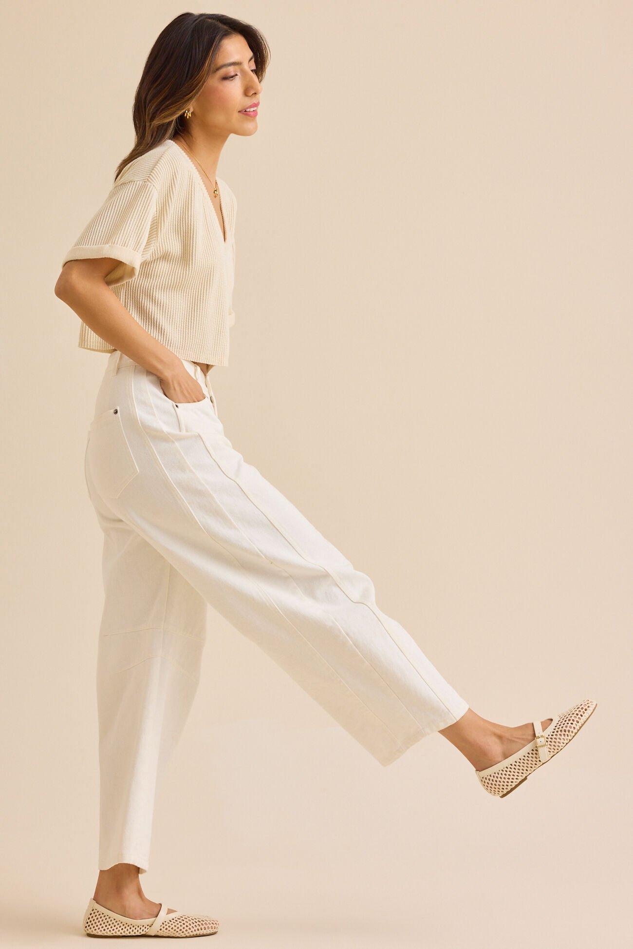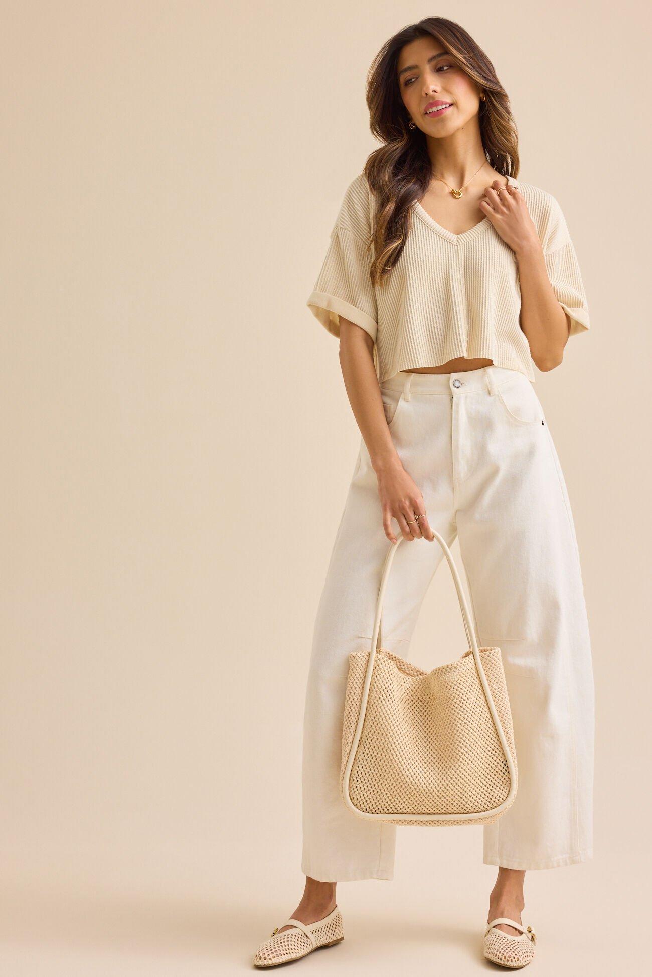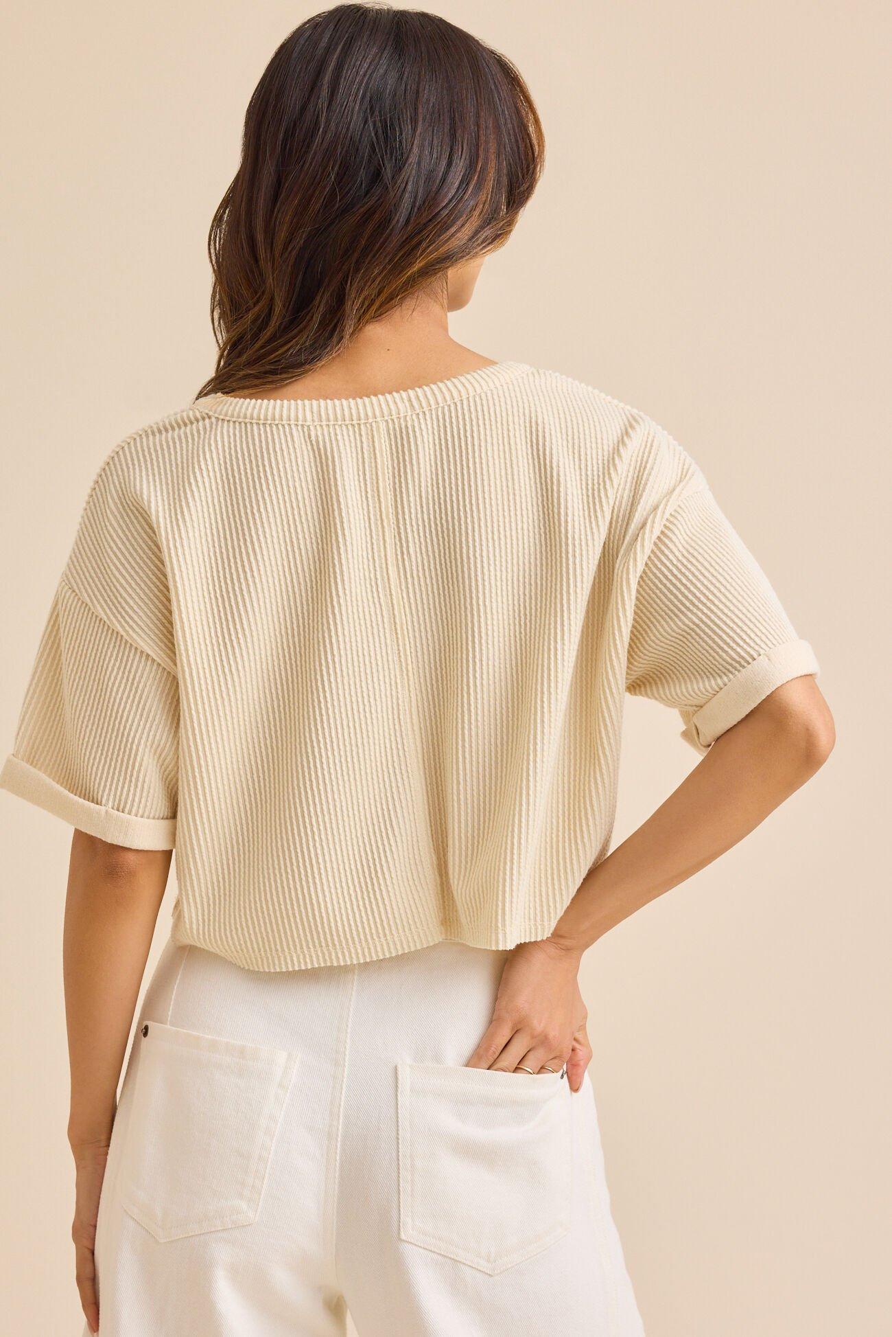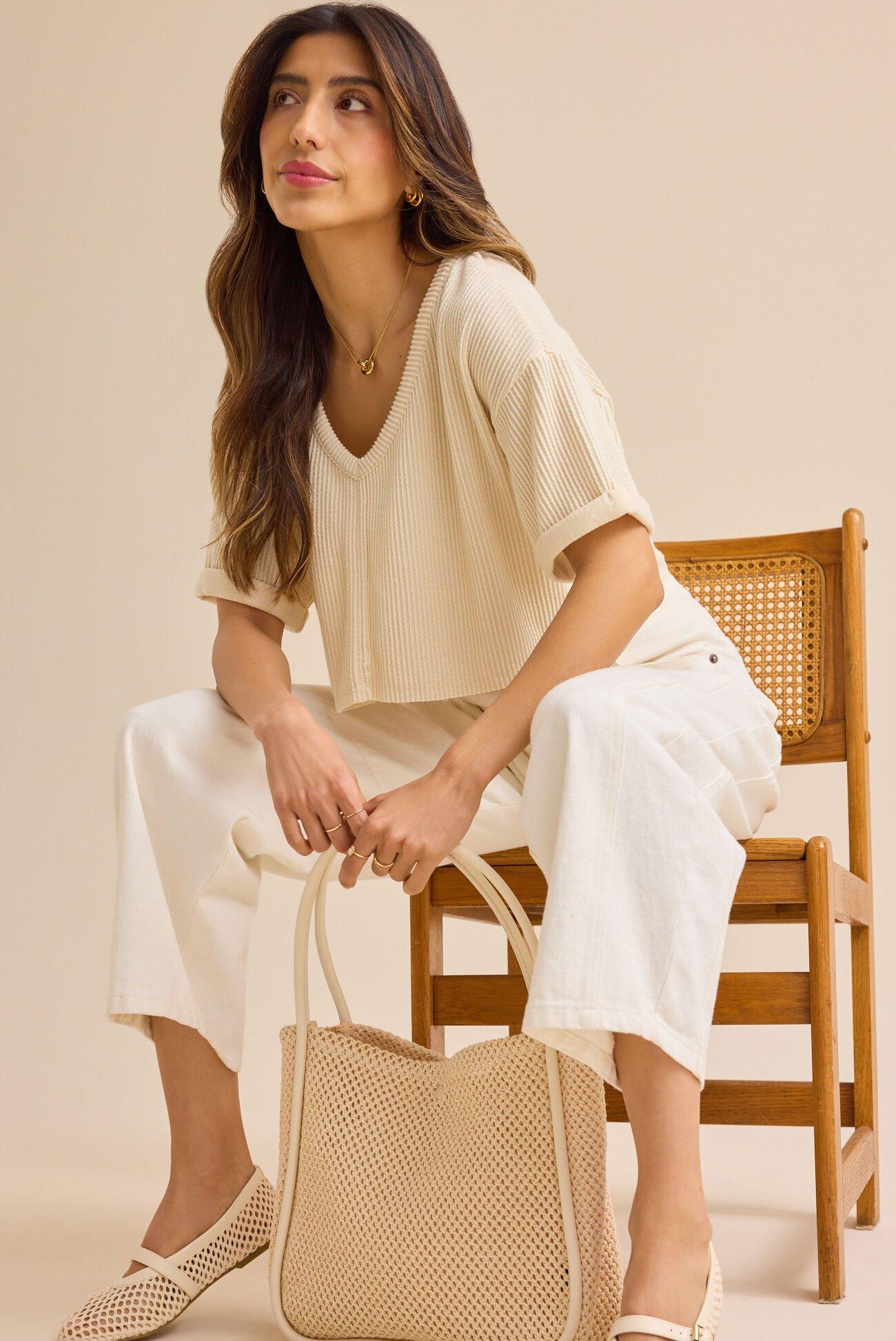This relaxed ribbed crop top is a must-have for any season. The v-neckline, dolman sleeves, and ribbed detailing are every reason to love this not-so-basic basic top.