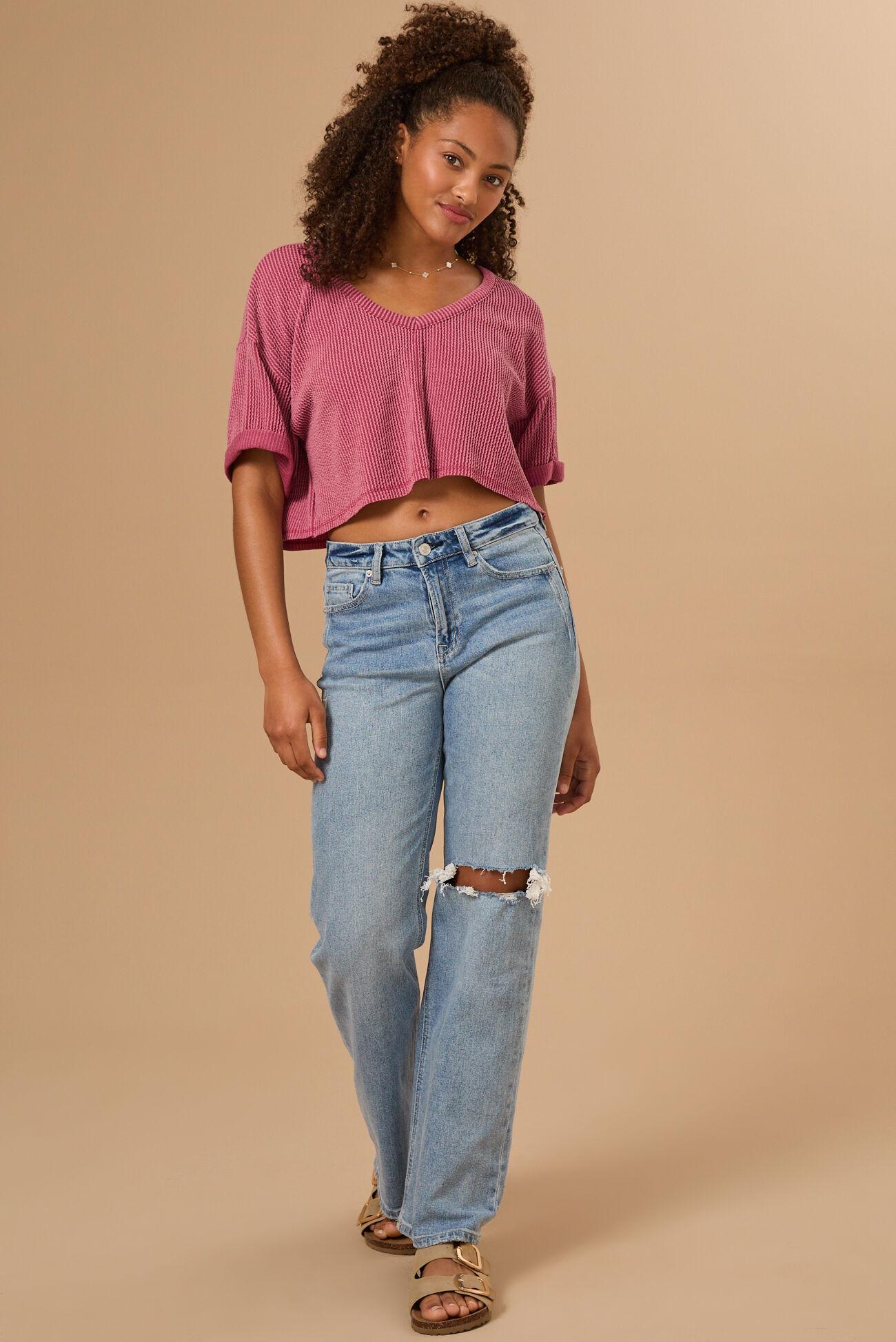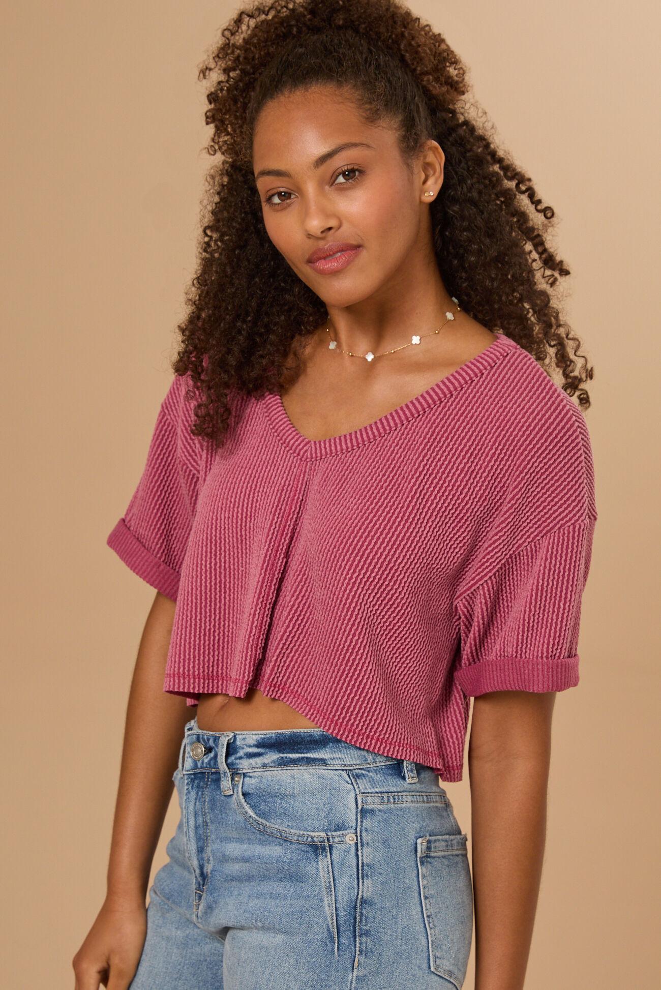 This relaxed ribbed crop top is a must-have for any season. The v-neckline, dolman sleeves, and ribbed detailing are every reason to love this not-so-basic basic top.