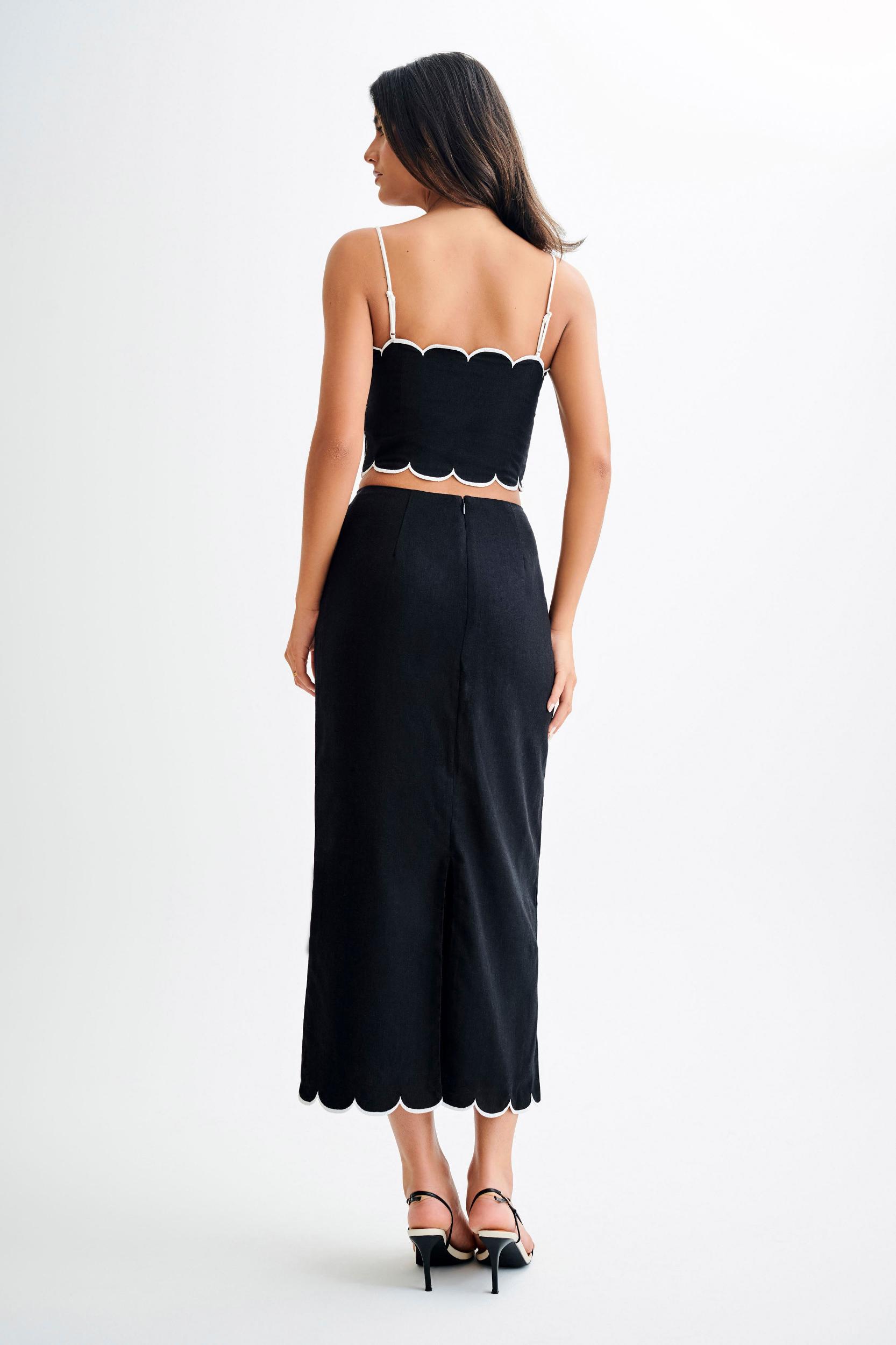 Classic contrast.Elegance meets sophistication in our ALESSIO Scalloped Linen Top, a timeless piece that exudes effortless style. The straight neckline offers a sleek and refined look, while delicate scalloped detailing along the neckline and hem adds a touch of feminine charm. Stand out with the contrast scalloping and strap design, creating a captivating visual appeal. With the convenience of a side zipper and adjustable straps, achieving the perfect fit has never been easier. Crafted from premium linen and fully lined for comfort, this top is as practical as it is chic, making it a versatile addition to your wardrobe for any occasion. Complete the look with the Alessio Scalloped Midi Skirt.