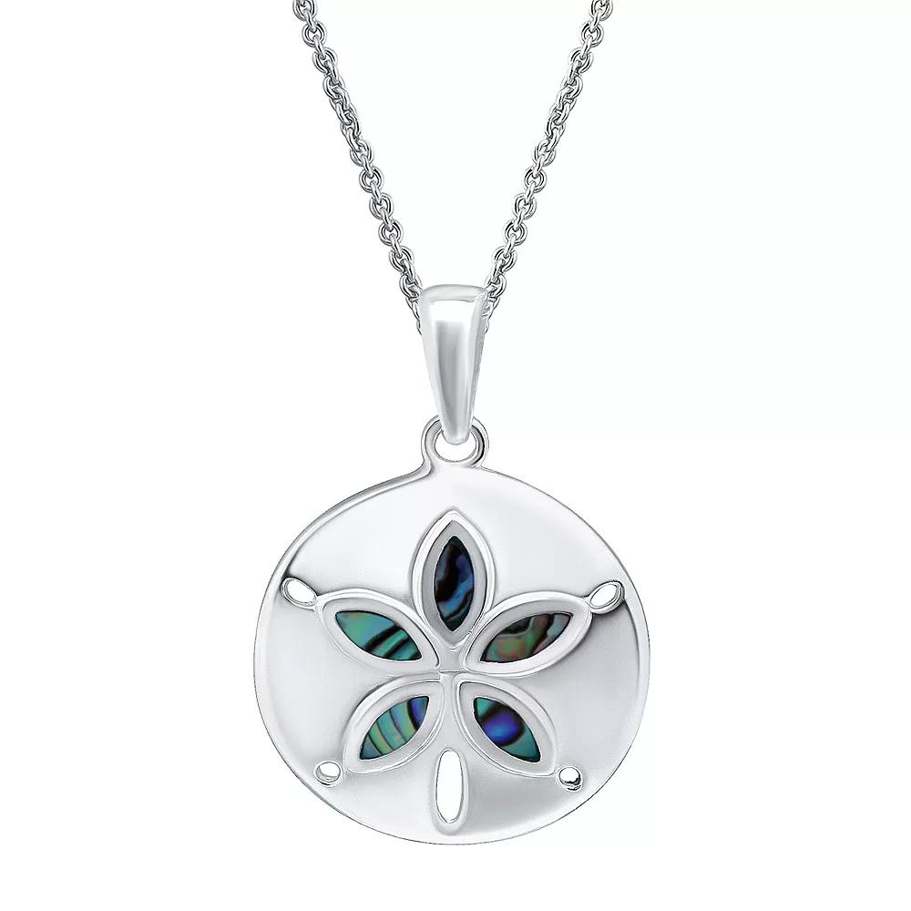 Add a laid-back vibe to your casual wardrobe with this Aleure Precioso sand dollar flip-flop necklace. Add a laid-back vibe to your casual wardrobe with this Aleure Precioso sand dollar flip-flop necklace. Pendant size: 1"L x 1/2"W Chain length: 18 in. Chain type: cable Nickel free Metal: brass Plating: fine silver Finish: polished Packaging: pouch Abalone accents Gemstones may have been treated to enhance their appearance. Special care may be required. Please visit our Gemstone Treatment & Special Care Guide for more information. Size: 18". Color: Multicolor. Gender: female. Age Group: adult.