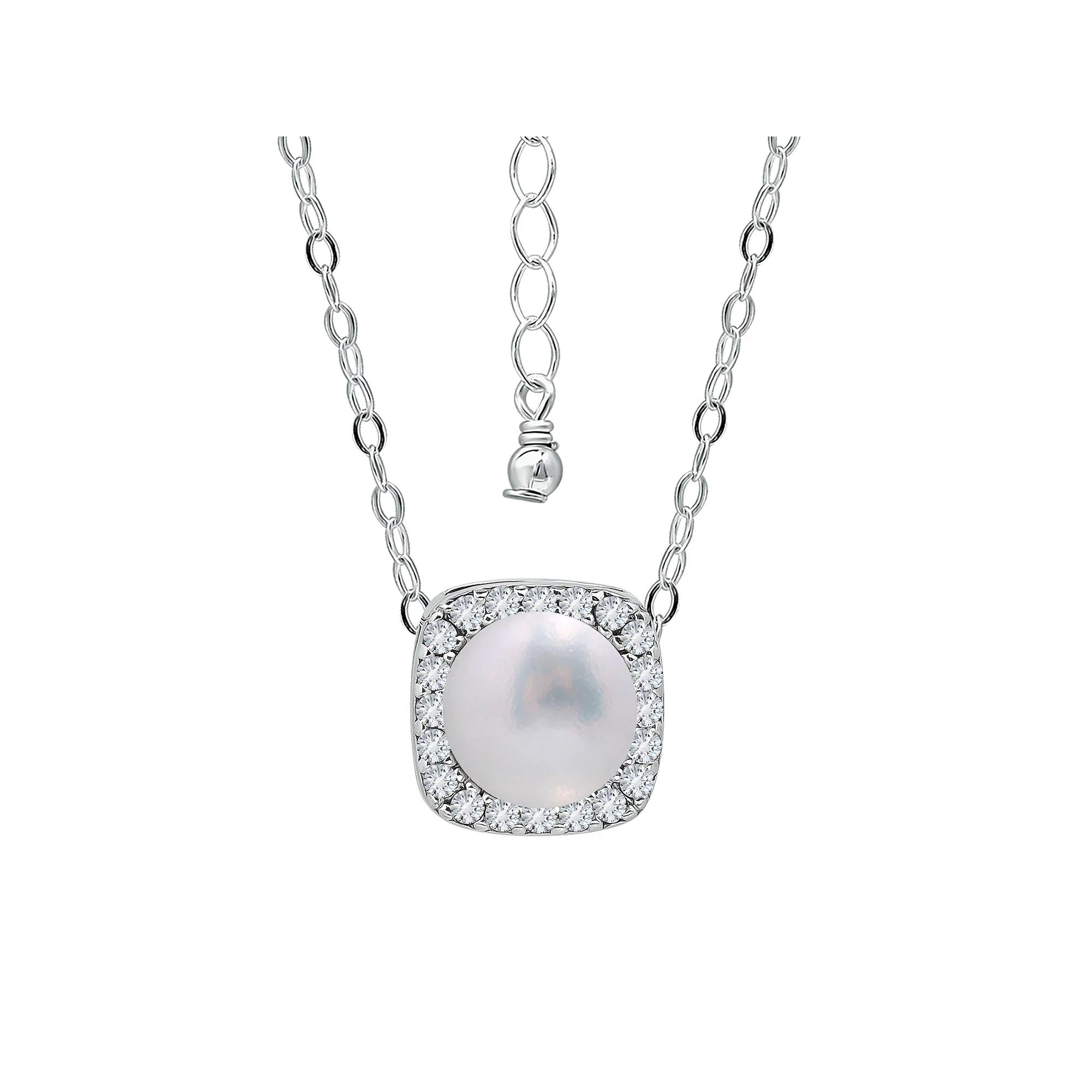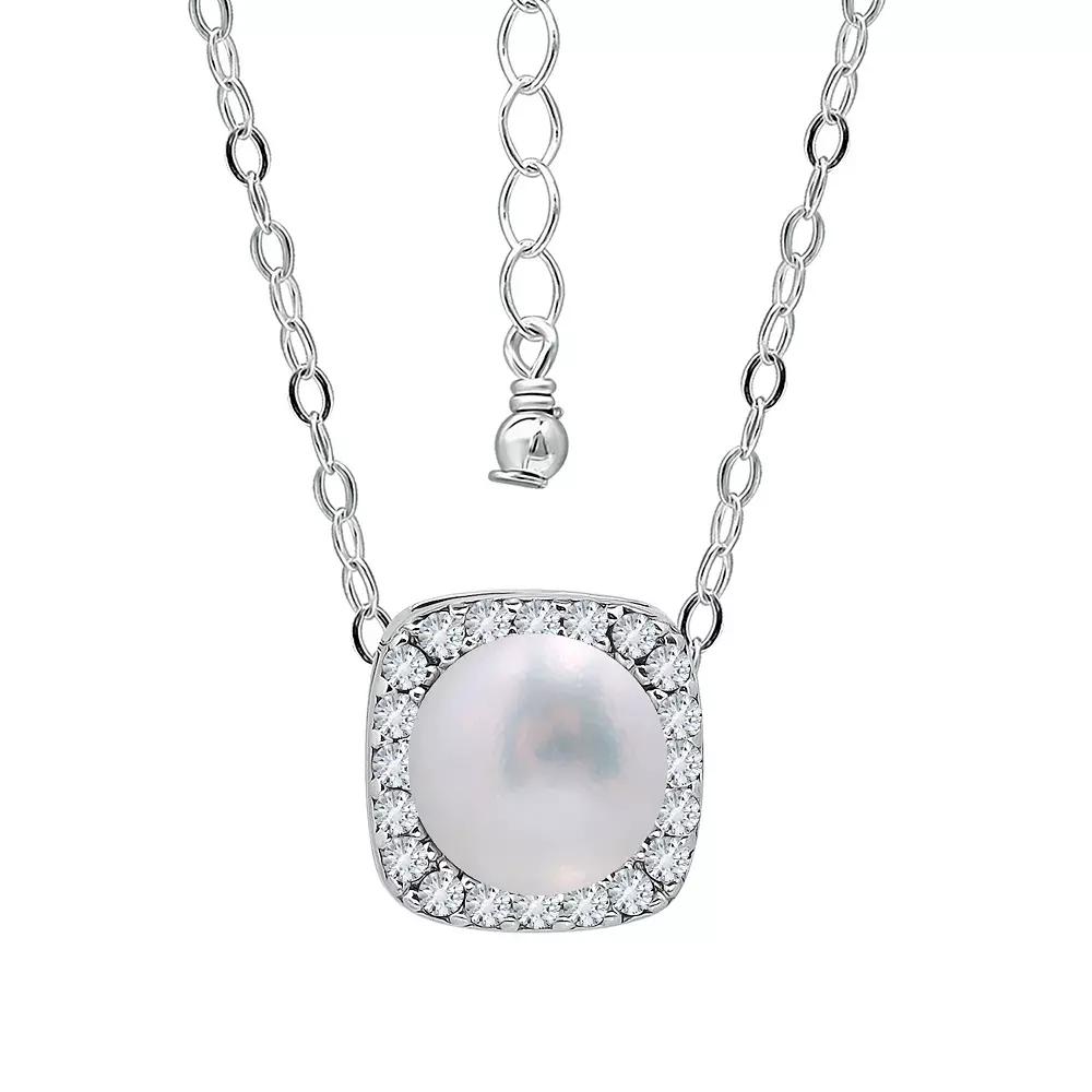 An updated version of the Halo trend incorporating Freshwater Pearl in this pendant on a 16"chain with a 2" extender. | Belk & Co 2.15 Cttw 7Mm Freshwater Pearl Center Stone Cubic Zirconia Halo Necklace 16" With 2" Extender, Sterling Silver, 18 In
