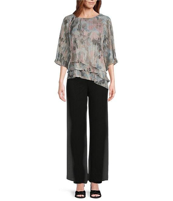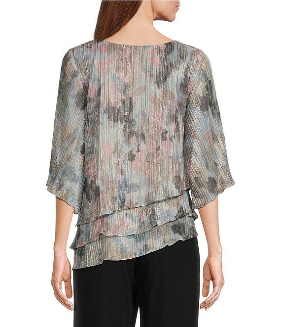 Alex Evenings 3/4 Sleeve Crew Neck Asymmetrical Triple Tier Hem Printed Chiffon Blouse