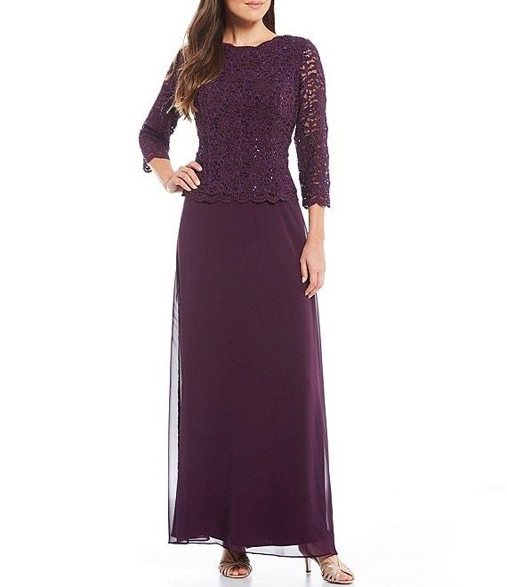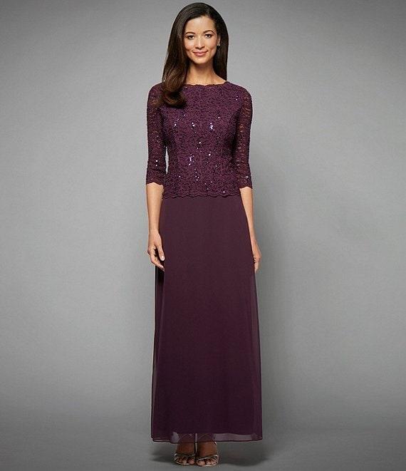 Alex Evenings 3/4 Sleeve Sequined Lace Crew Neck Scalloped Bodice Chiffon Skirted Gown