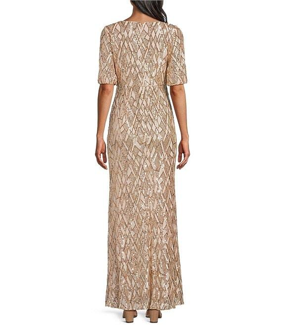 From Alex Evenings, this dress features: Stretch sequin fabrication V-neckline Gown silhouette Bubble hem elbow sleeve Geometric sequin print Center back zipper closure Approx. 57.5" in length Polyester Hand wash cold/lay flat to dry Imported.