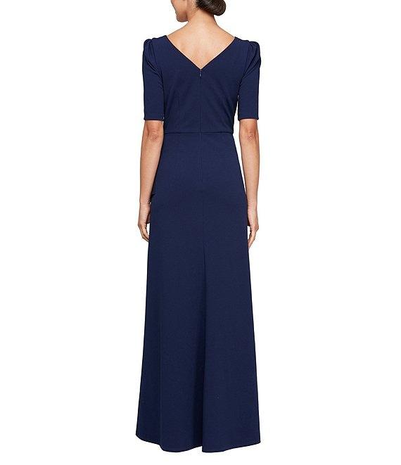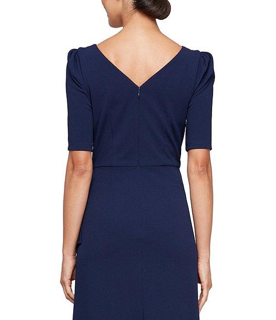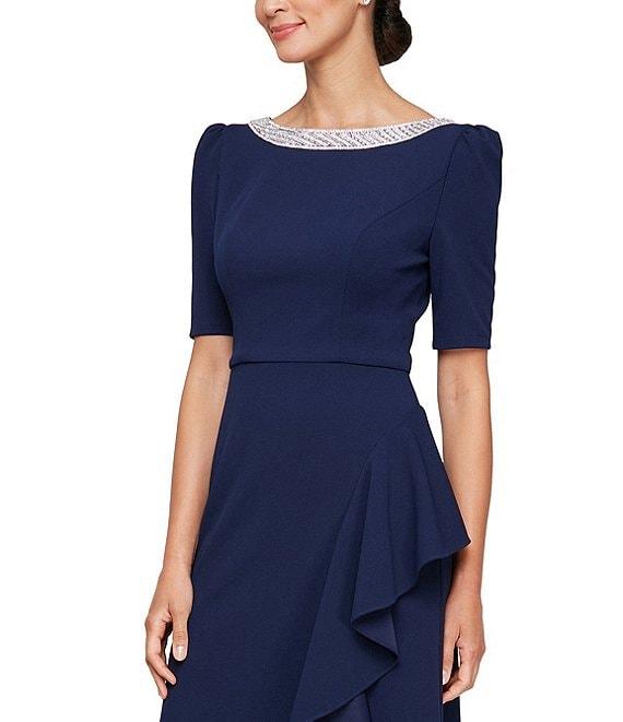 From  Alex Evenings Petite, this dress features: Crepe fabrication A-line silhouette Boat neckline  3/4 sleeves Embellished detail Ruffle cascade Fully lined  Straight hemline  Center back zip closure Approx. 49.5" length Polyester/spandex Hand wash Imported
